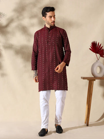 Elevate your ethnic wardrobe with the Maroon Royale Woven Cotton Kurta, a perfect blend of...