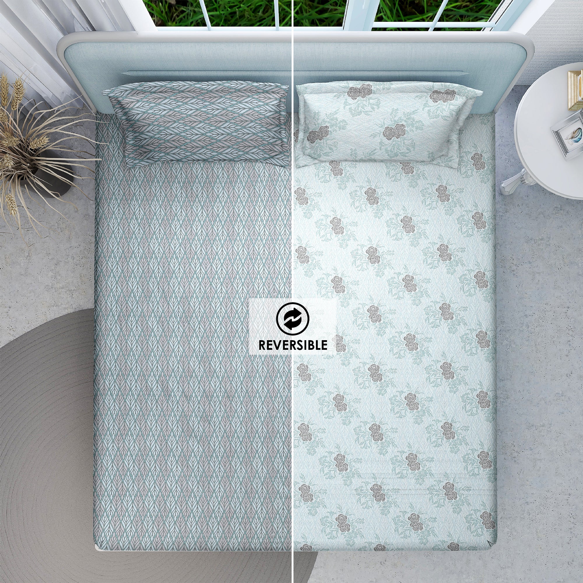 The reversible design offers two unique looks in one bedsheet.