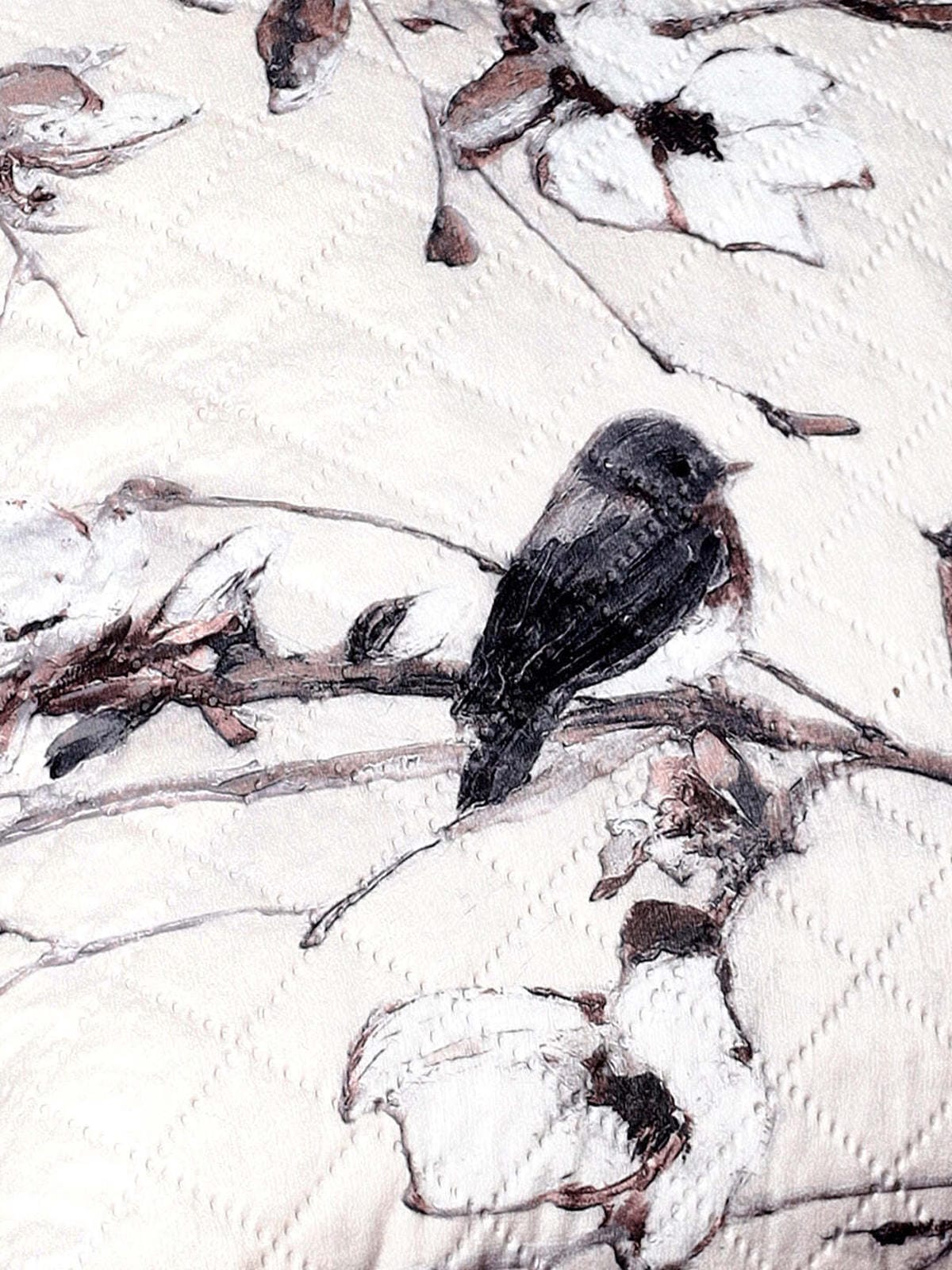 Bring the serene beauty of nature into your home with our exquisite 16 x 16 inches quilted cushion cover, featuring a stunning "Birdsong & Blossoms" design. Crafted on a soft beige quilted base with a delicate diamond stitch pattern, this cushion cover showcases a detailed hand-painted-style print of blooming magnolia branches and perched birds, evoking a peaceful, timeless charm.