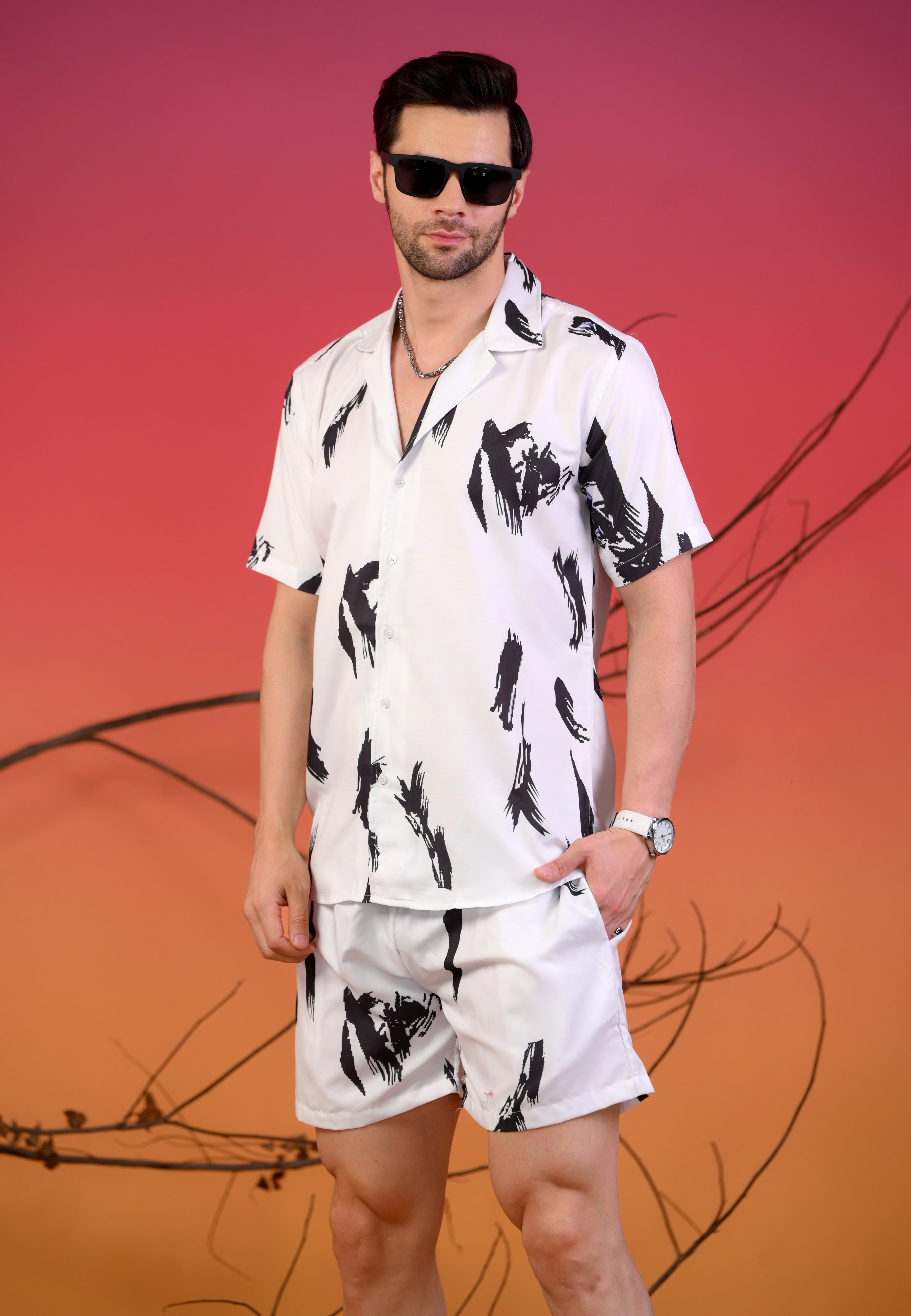 Make a statement with the Black Brushstroke Cuban Collar Co-ord Set, featuring an abstract black brushstroke design on a crisp white base. This set includes a short-sleeved Cuban collar shirt and matching relaxed-fit shorts, offering a perfect blend of contemporary style and all-day comfort. Crafted from lightweight and breathable fabric, it’s ideal for casual outings, creative expressions, or simply standing out with effortless flair. Whether you're strolling through the city or unwinding on a vacation, this set is your go-to for bold, modern styling.