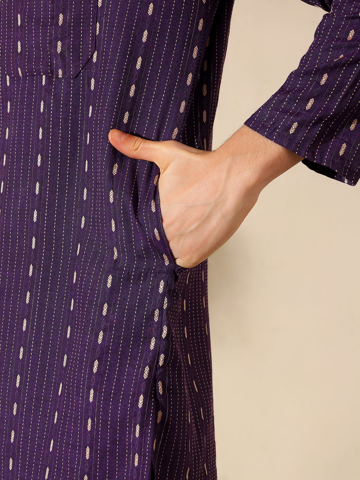 Make a regal statement with the Royal Plum Woven Cotton Kurta, where traditional craftsmanship meets modern grace. This striking kurta comes in a rich plum purple hue, beautifully enhanced with golden woven motifs and delicate vertical thread lines. Made from soft, breathable cotton, it ensures comfort through long festive hours or cultural gatherings. The Mandarin collar and half-button placket lend a clean, classic look, while the chest pocket adds everyday practicality. Whether for festive celebrations, evening functions, or traditional get-togethers, this kurta adds sophistication and vibrant charm to your ethnic wardrobe.