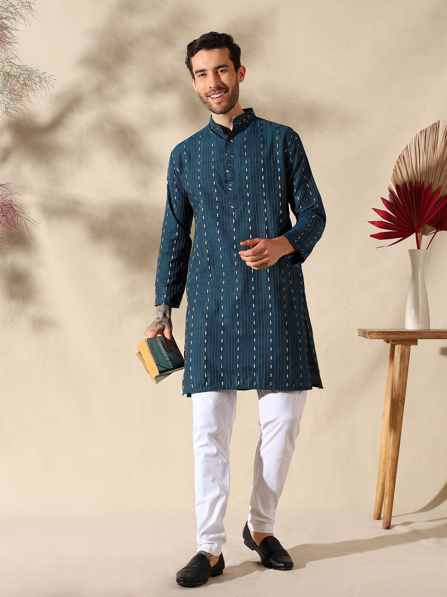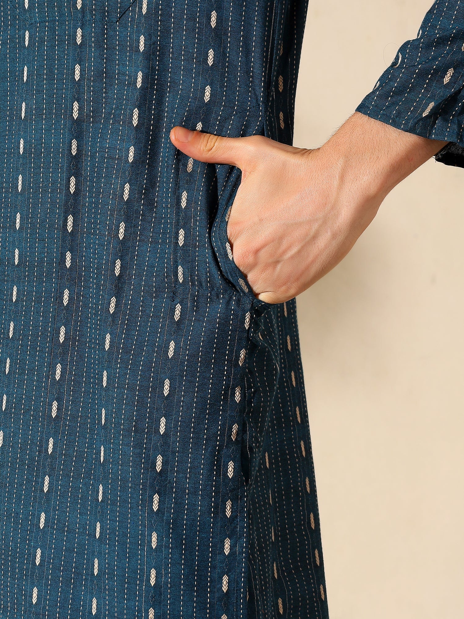 Channel effortless charm with the Teal Elegance Woven Cotton Kurta, designed for the discerning man who values both style and comfort. Featuring a captivating teal blue base, this kurta is adorned with subtle golden woven motifs and fine vertical thread lines that add depth and refinement. The breathable cotton fabric ensures all-day ease, while the Mandarin collar and half-button placket offer a sleek, contemporary silhouette. Complete with a functional chest pocket, this kurta is ideal for festive occasions, cultural celebrations, or everyday, stylish ethnic wear.