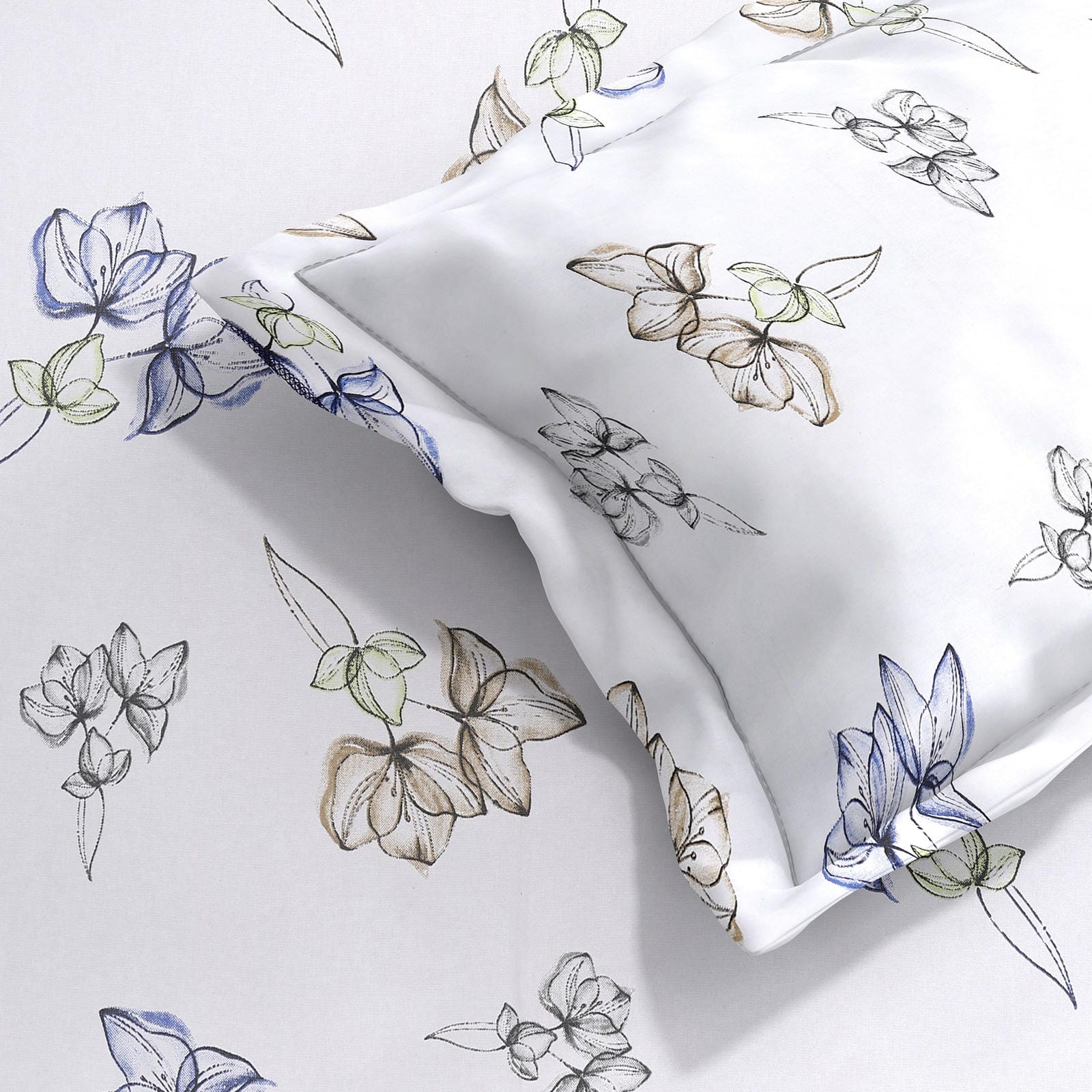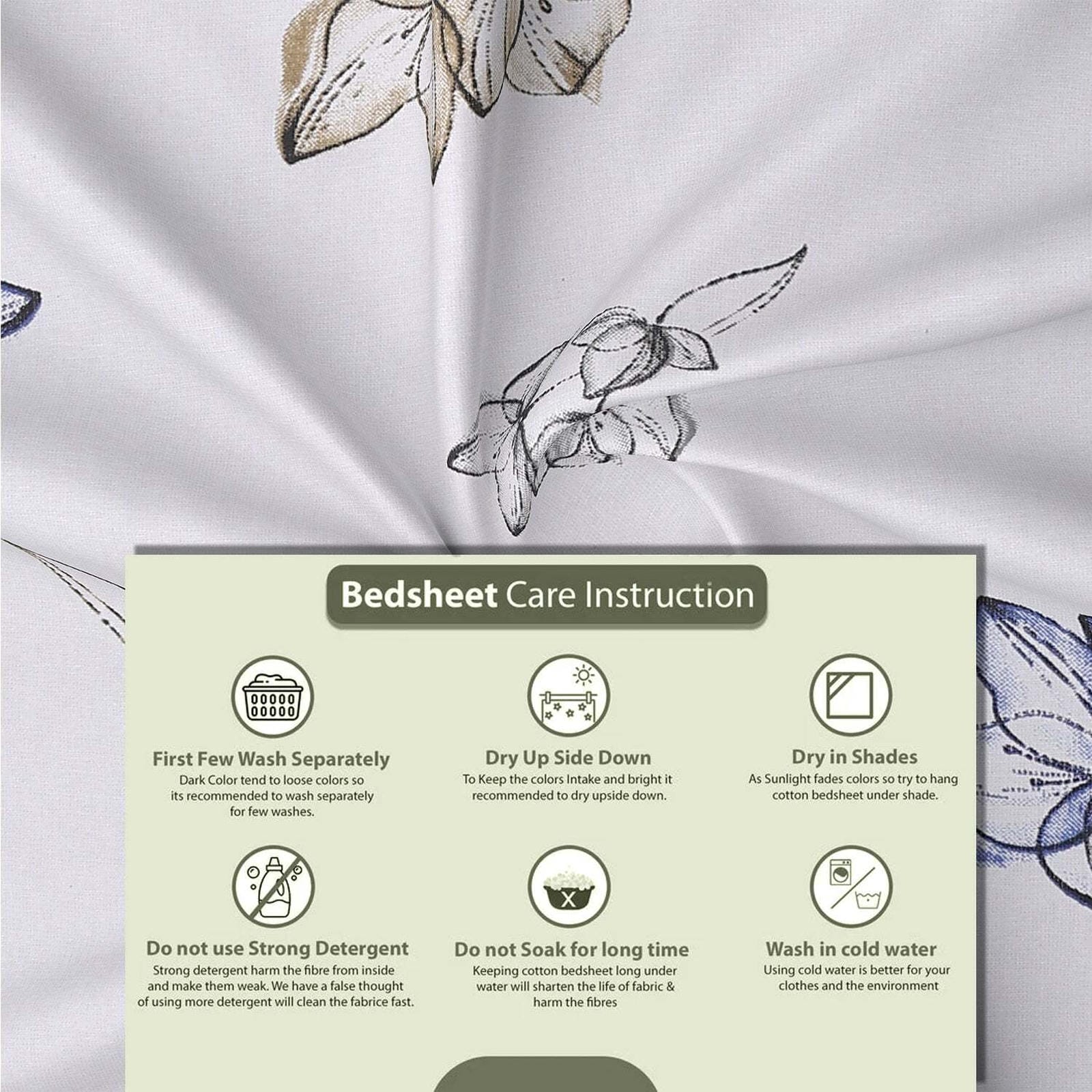 Designed with a soothing palette of snow white, earthy beige, olive green, and deep blue, this bedsheet offers a clean and timeless look. The delicate botanical patterns beautifully complement both modern and classic interiors, giving your room a subtle touch of nature-inspired sophistication.