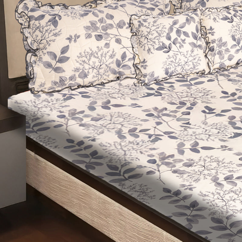 Create a tranquil and stylish retreat with this 5-Piece Quilted Bedding Set, featuring a soothing grey leaf botanical print on a crisp white base. Inspired by nature, this elegant design blends modern minimalism with timeless charm, making it the perfect choice for a peaceful and sophisticated bedroom. The quilted pillow covers and cushions with frill details enhance the refined look, while the breathable fabric ensures ultimate comfort.
