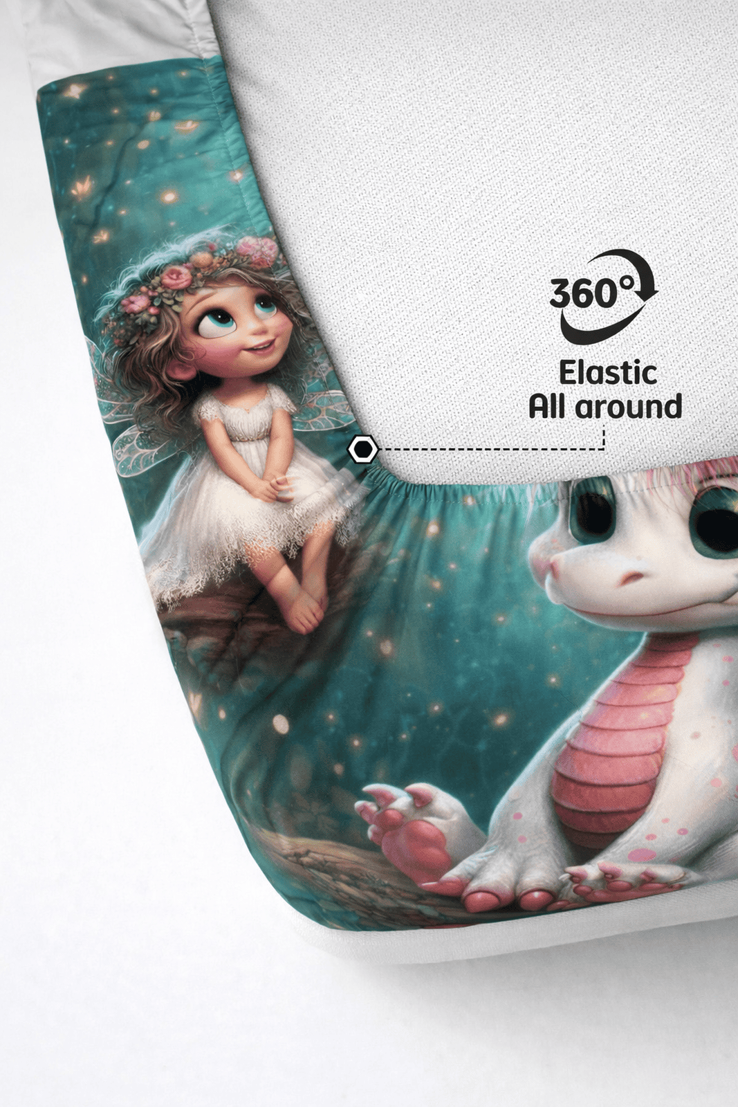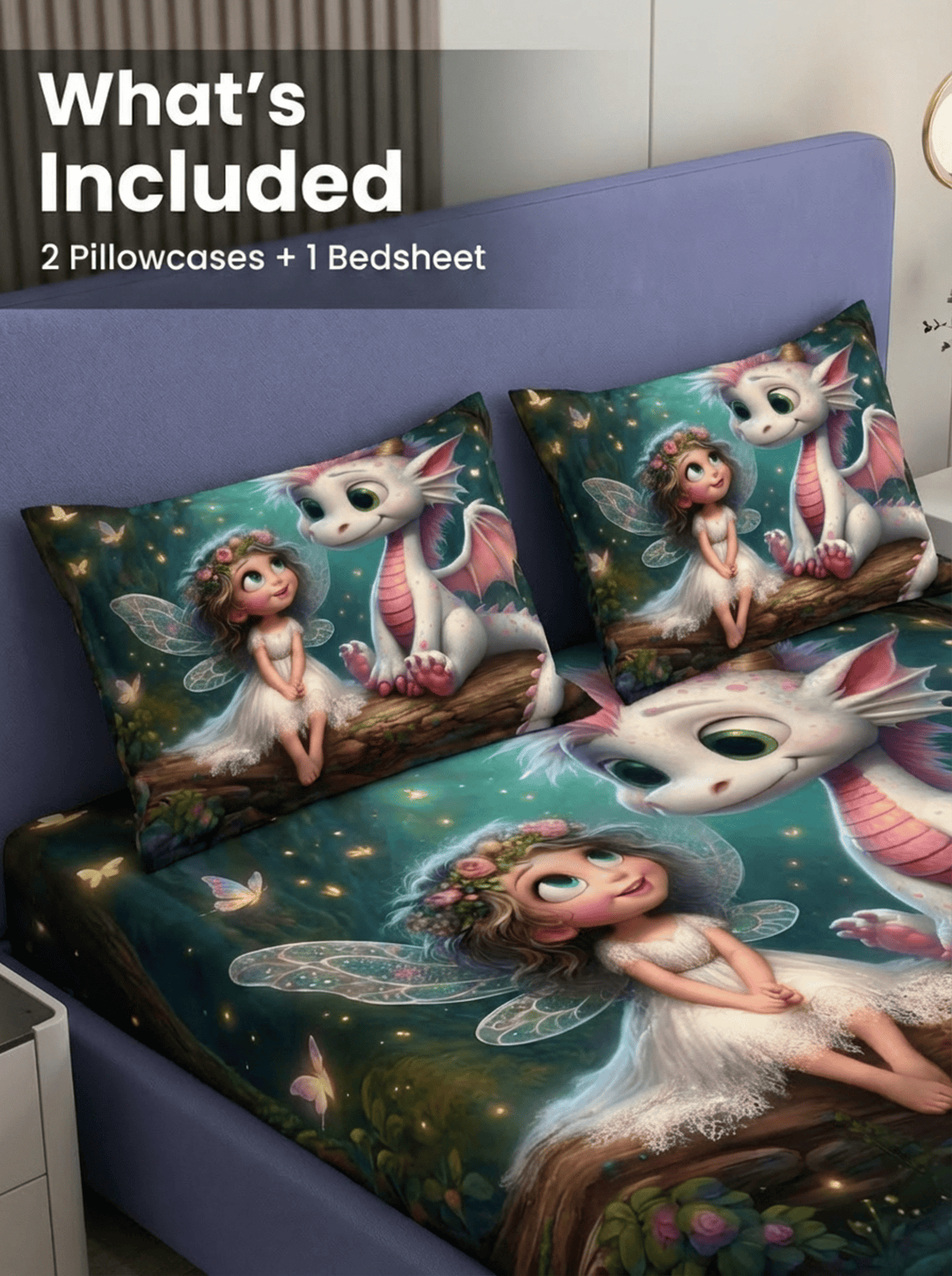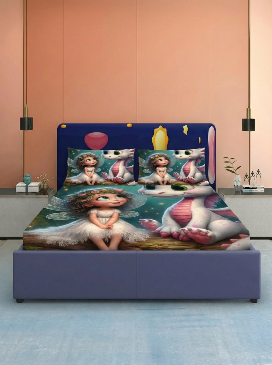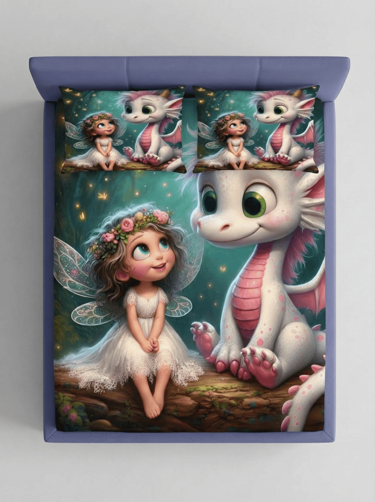 Step into a world of imagination and magic with this Fairy & Dragon Dreams bedsheet. Featuring a charming fairy with delicate wings and a cute baby dragon under a glowing night sky, this design adds warmth, fantasy, and storybook beauty to any bedroom.