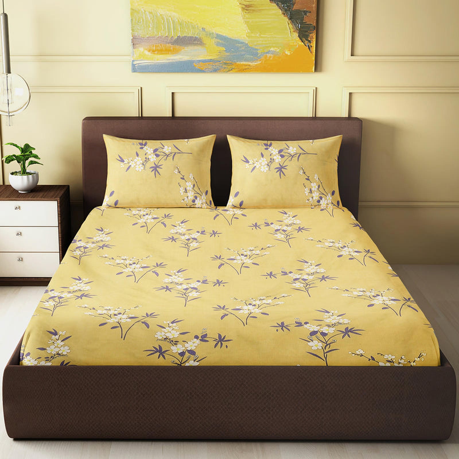 Brighten up your bedroom with the timeless charm of our Golden Blossom Bedsheet. The vibrant mustard-yellow backdrop adorned with delicate white floral clusters and leafy accents adds freshness and positivity to your living space. Its minimal yet elegant design makes it perfect for both modern and traditional homes.