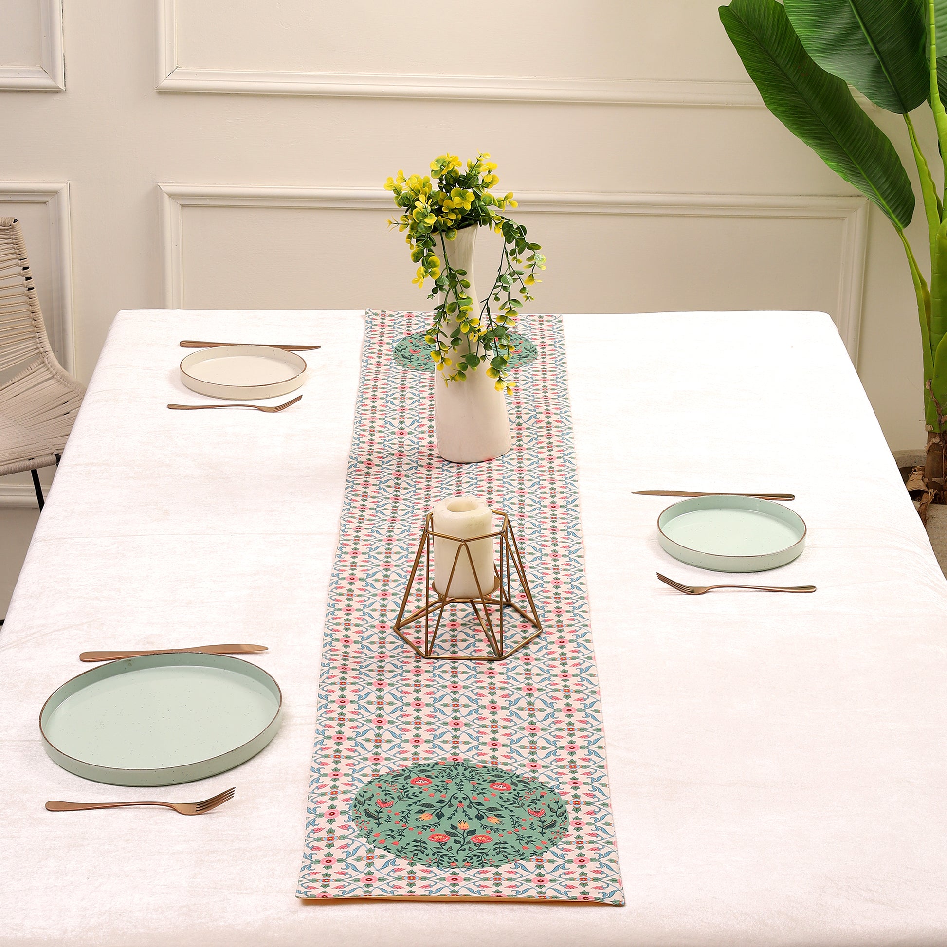 · Add an artistic charm to your dining table with our Off White With Green Plate Design Table Runner Set.