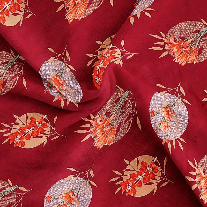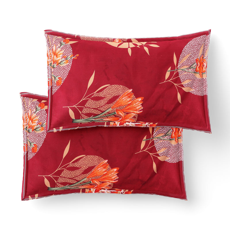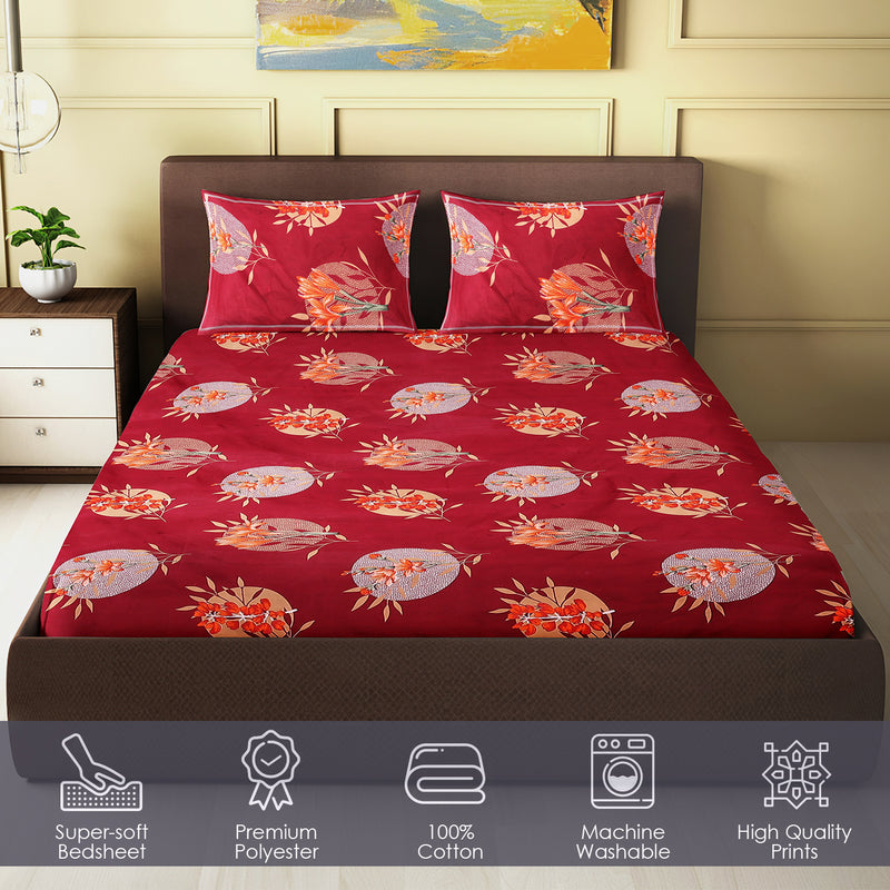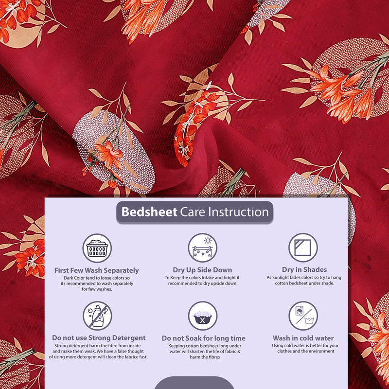 Add a touch of royal elegance and warmth to your bedroom with our Gulnaar Charm Bedsheet. Designed on a rich maroon backdrop, it features artistic circular motifs with blooming patterns in shades of orange, beige, and lavender — creating a striking balance of boldness and grace.
