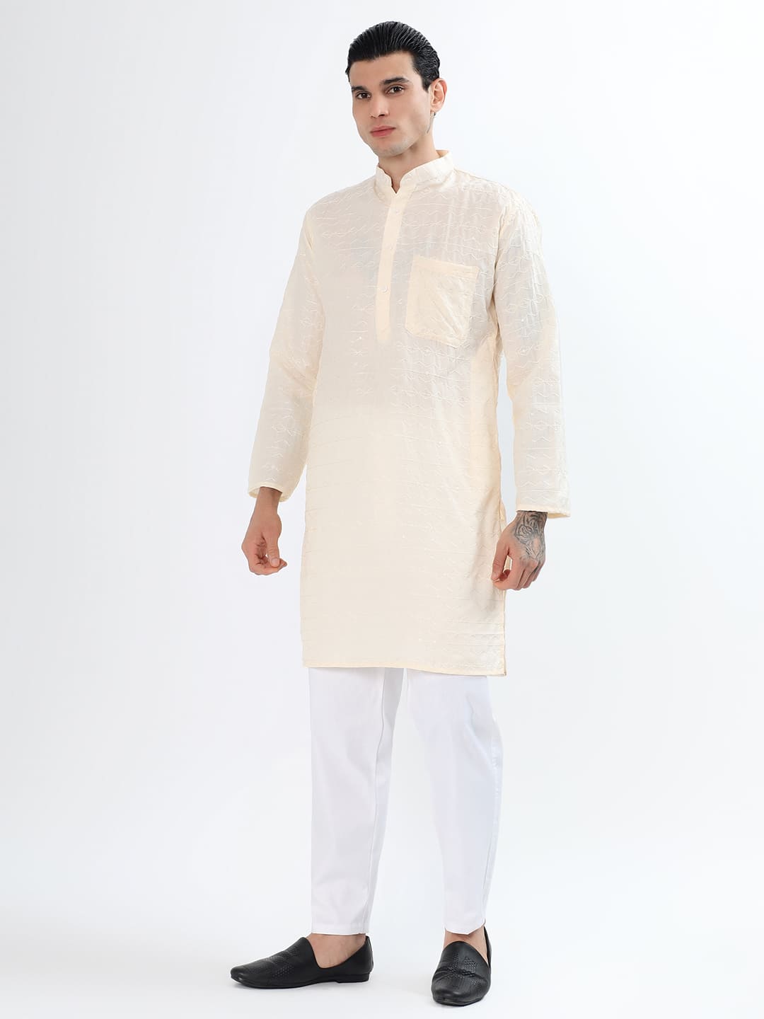 · Style: Turn heads in this bottle Ivory chikankari kurta, decked out with sequins for a dash of sparkle. This piece is both traditional and ultra-stylish, perfect for the dapper gent. Pair it with beige churidar and leather loafers for a suave, festive-ready look.
