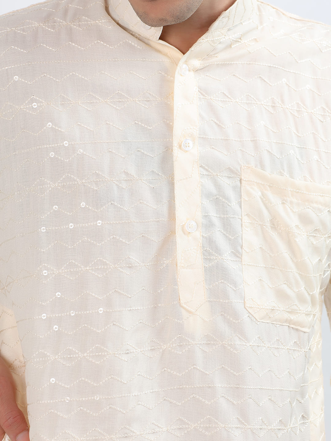 · Bring home timeless elegance with our Ivory Aura Embroidered Men’s Kurta, beautifully crafted in a soft and classic ivory colour. This kurta stands out with its all-over zigzag thread embroidery, giving it a rich, handcrafted texture while maintaining a calm and minimalist look.