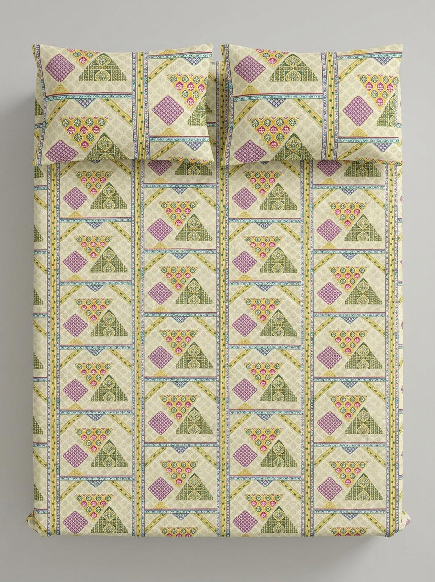 Enhance your bedroom décor with this elegantly designed Jaipuri Olive Prism Premium Bedsheet Set. Inspired by traditional Rajasthani patterns, this bedsheet features a unique combination of geometric triangle motifs and vertical stripe detailing in subtle earthy and pastel tones, creating a balanced and sophisticated look.