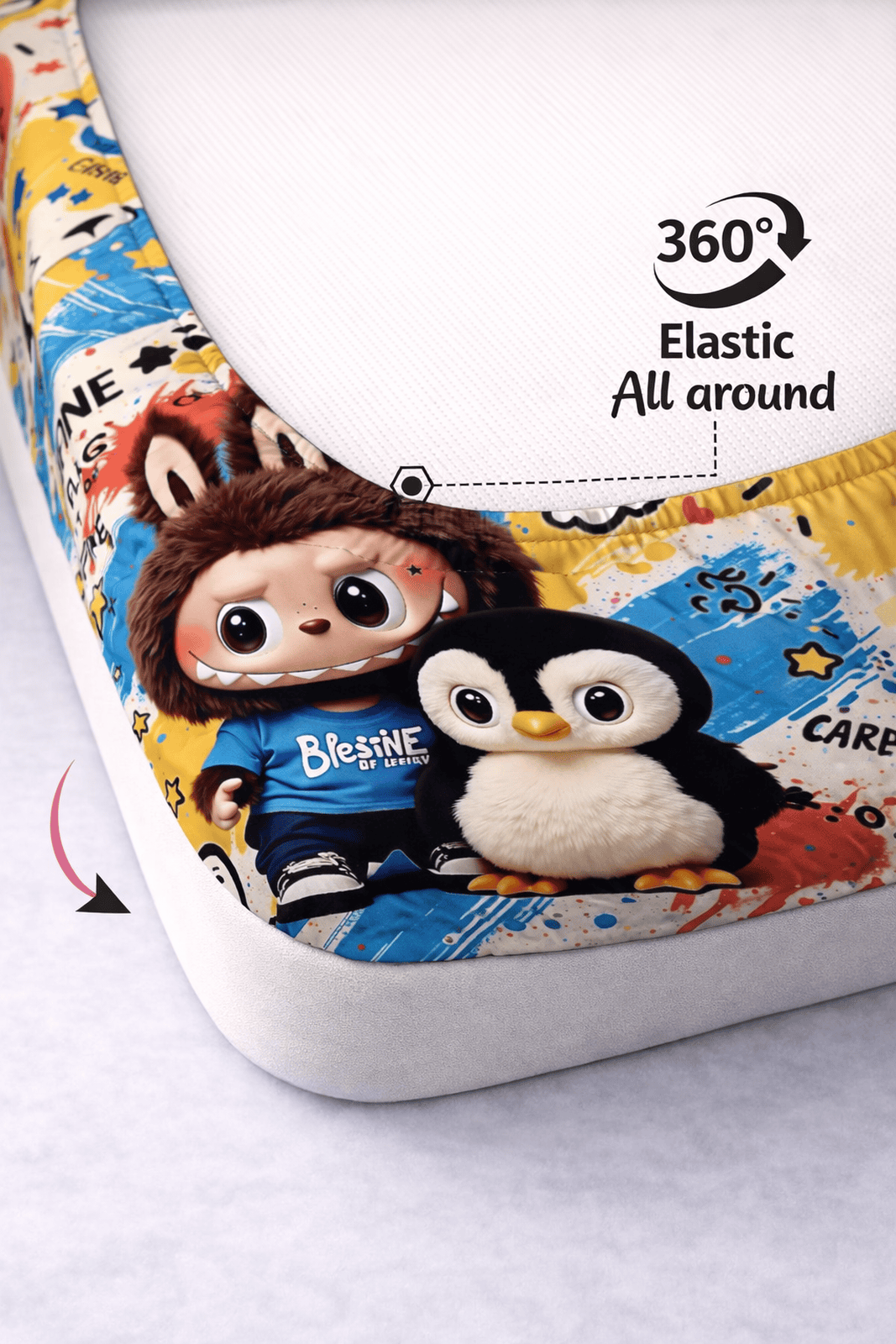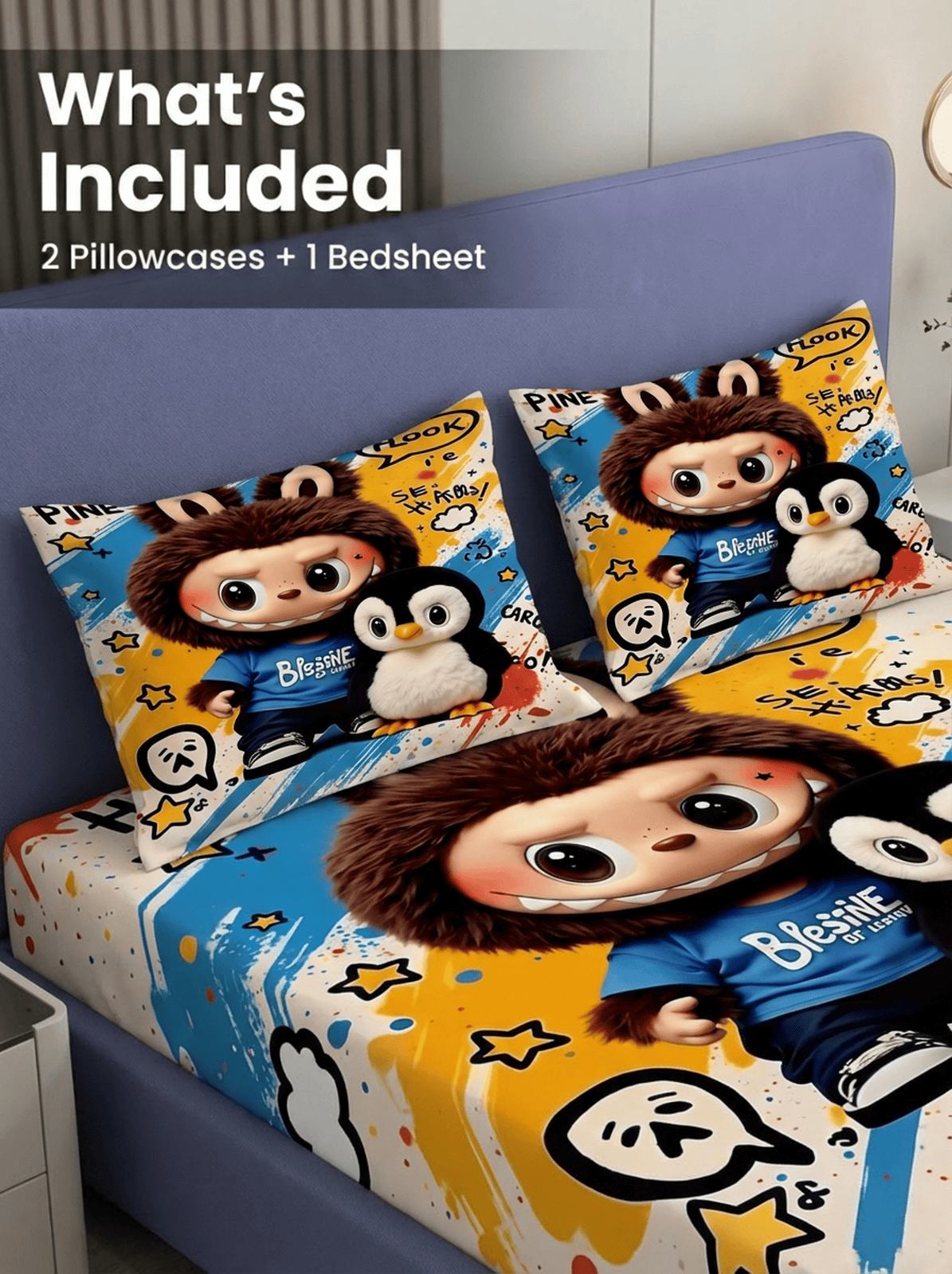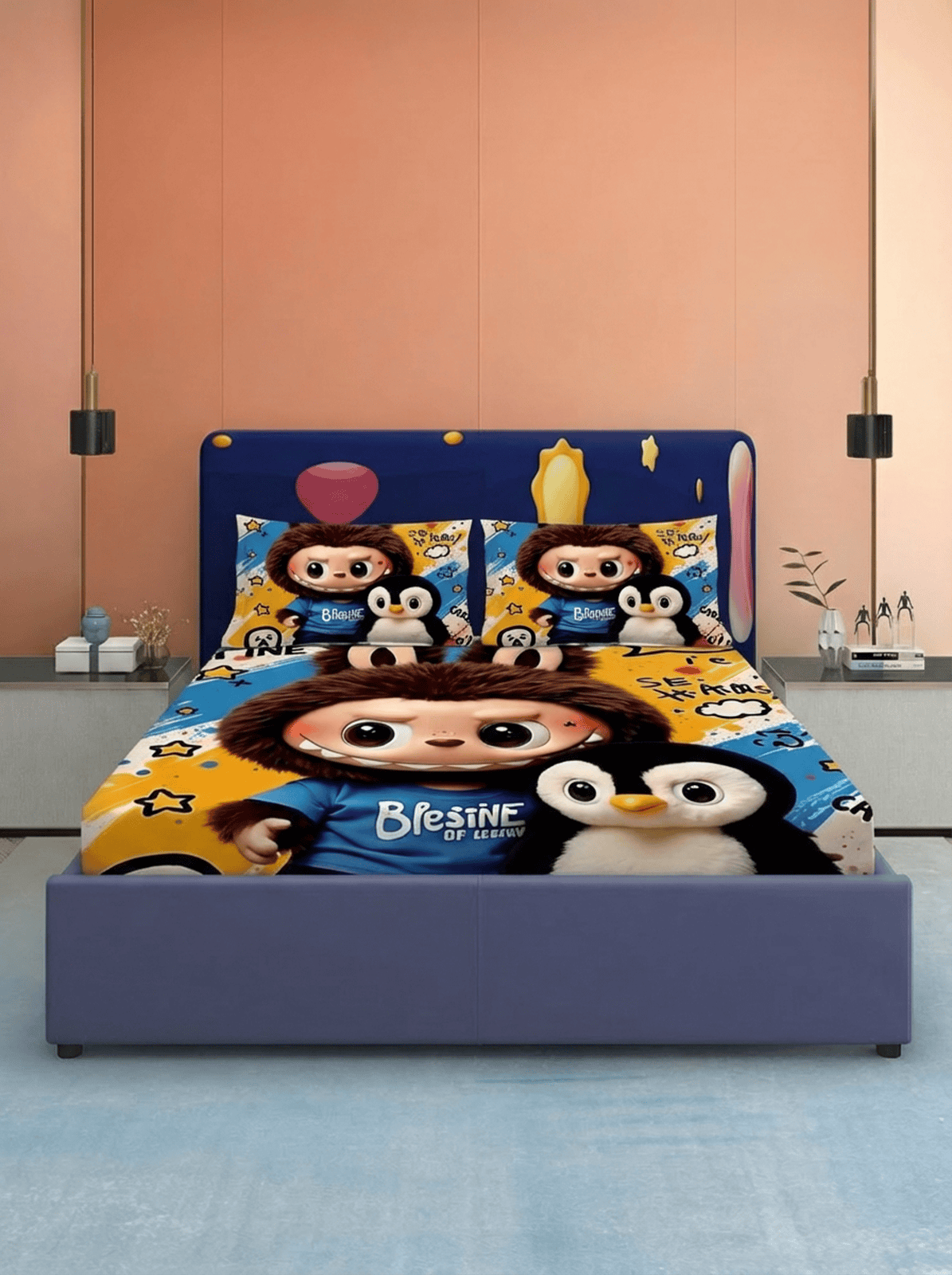 Bring playful energy and cuteness to your childโs bedroom with the Little Monster Buddy 7D Cotton Fitted Bedsheet. Featuring an adorable little monster and penguin cartoon design in vibrant pop-art colors, this bedsheet instantly creates a fun and cheerful atmosphere.