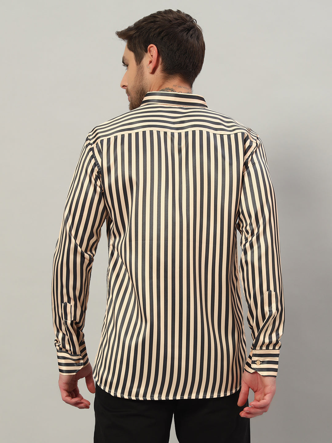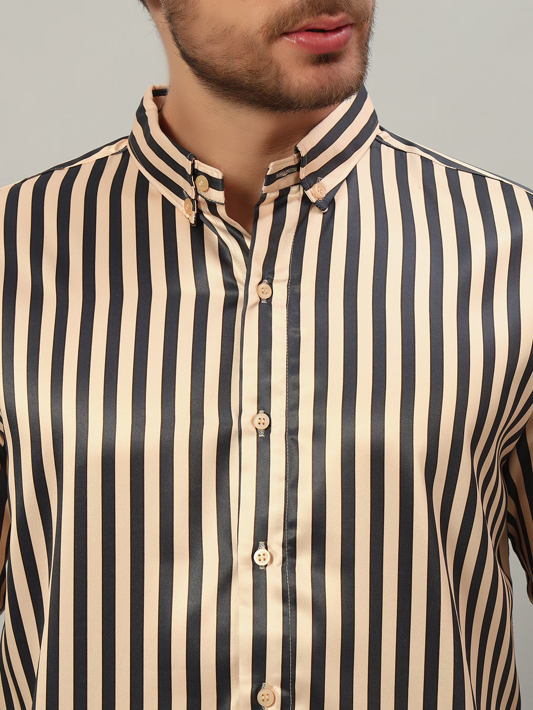 The Beige Striped Satin Cotton Shirt adds a touch of elegance with its smooth, refined finish and subtle stripe pattern.