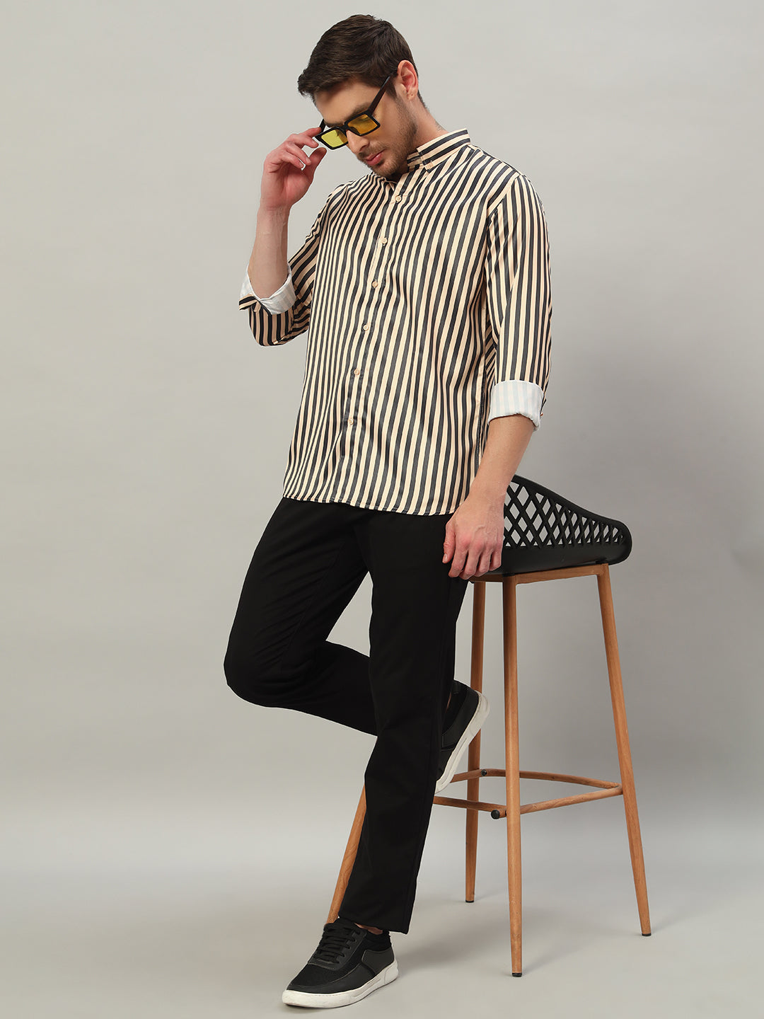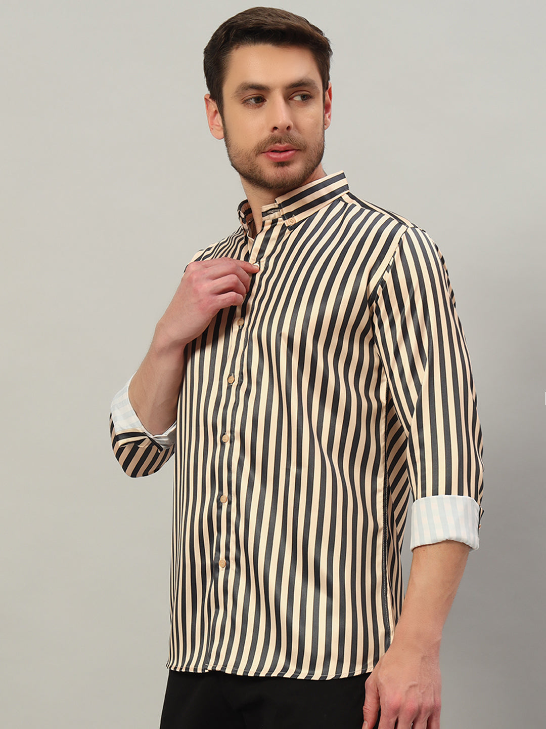 Discover the art of refined dressing. Our Premium Satin Cotton Point Collar Beige Striped Shirt is a testament to meticulous craftsmanship. Every detail, from the luxurious satin cotton to the perfectly aligned stripes, is thoughtfully designed. This shirt offers a polished look and exceptional comfort.