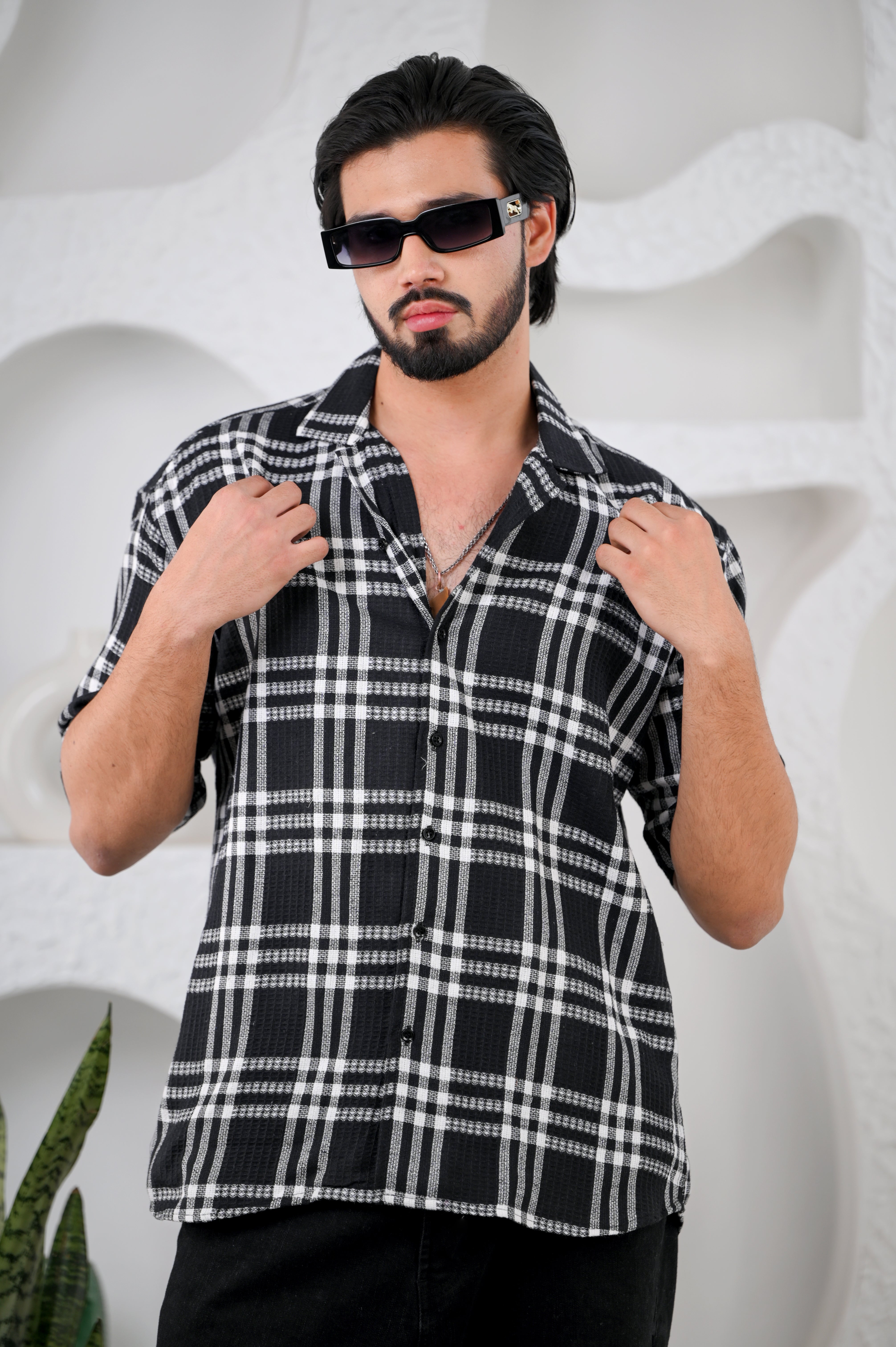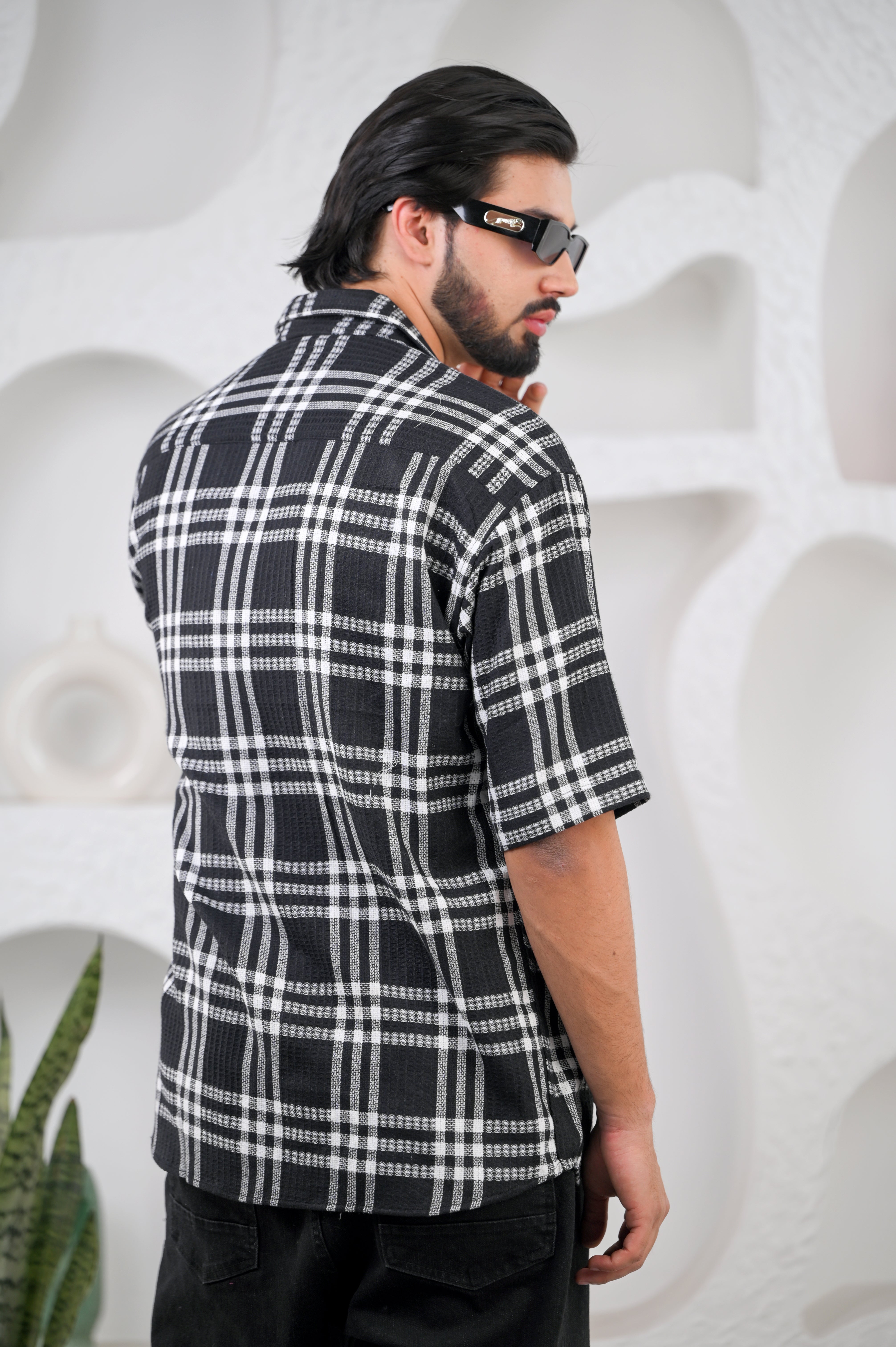 Where texture meets timeless sophistication. The Black Waffle Cotton Downshoulder Shirt: a study in refined comfort.