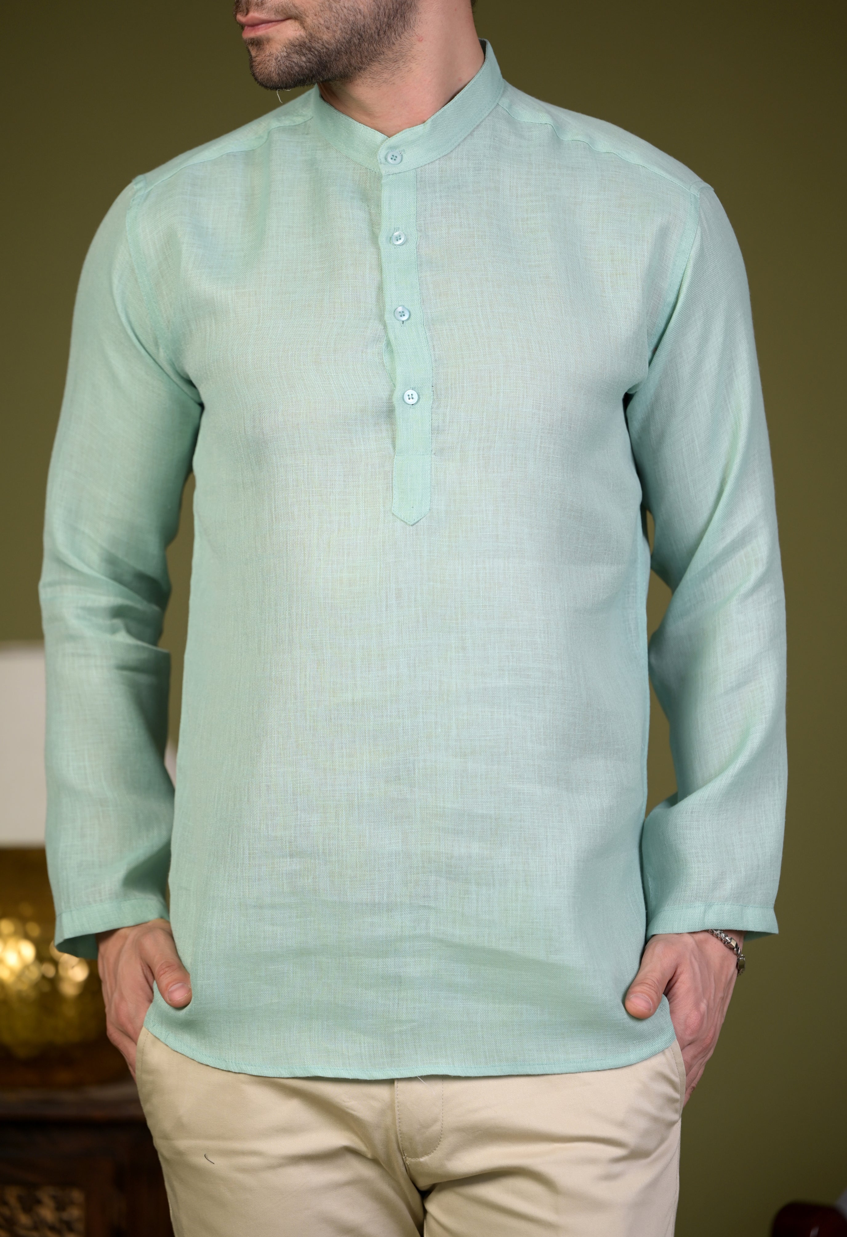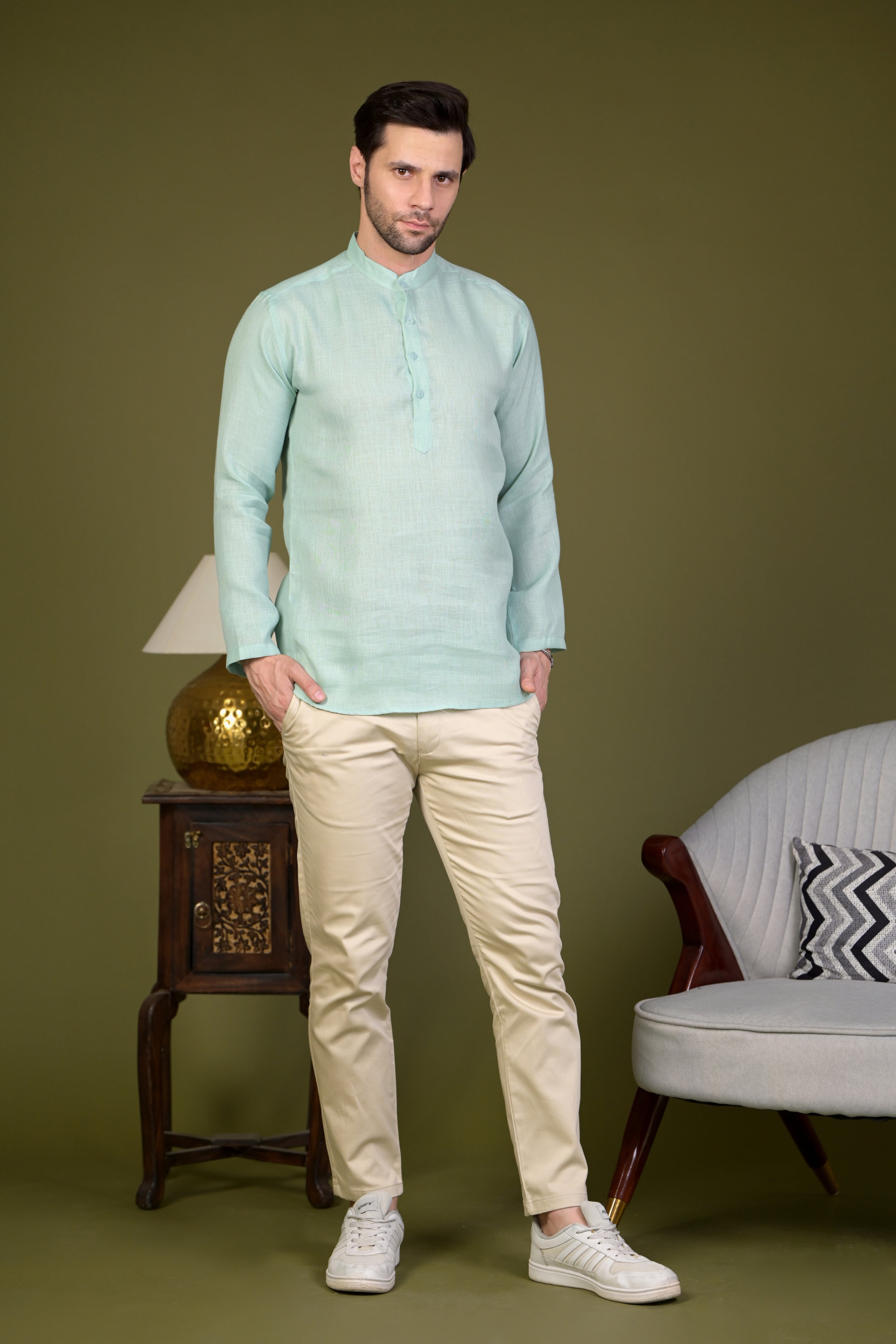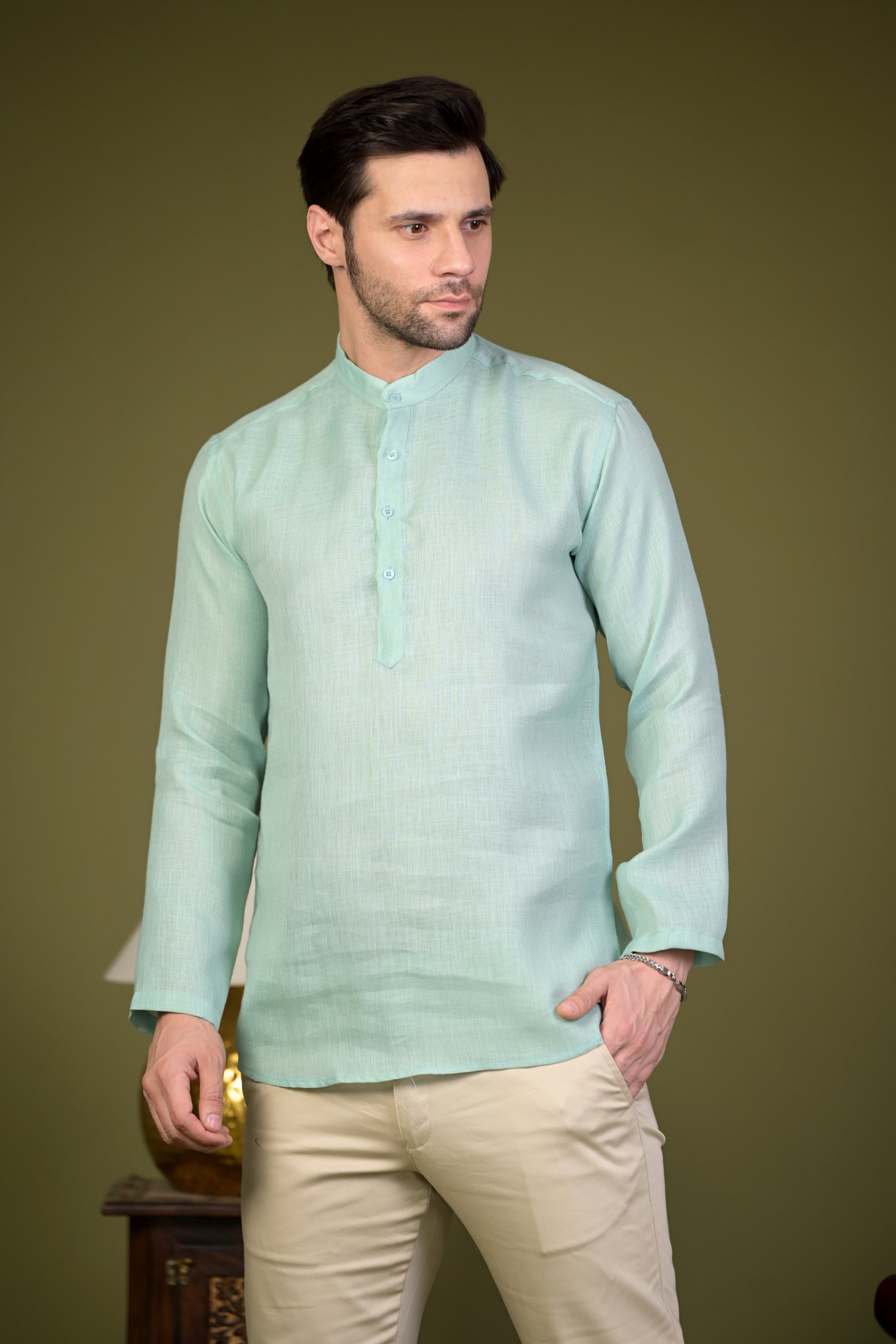 Step into effortless sophistication with the Mint Green Linen Blend Short Kurta—where comfort meets timeless elegance! 🌿✨
