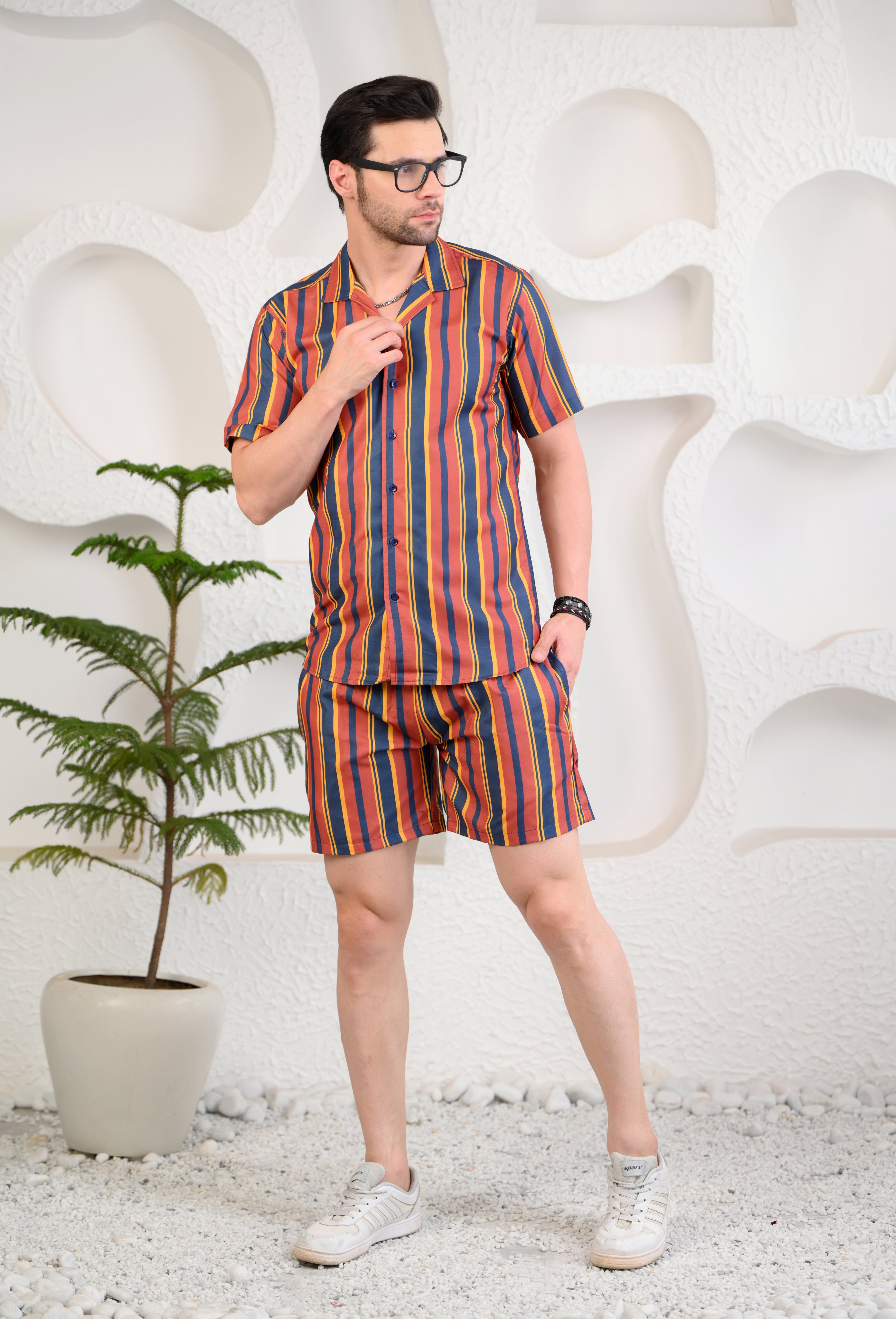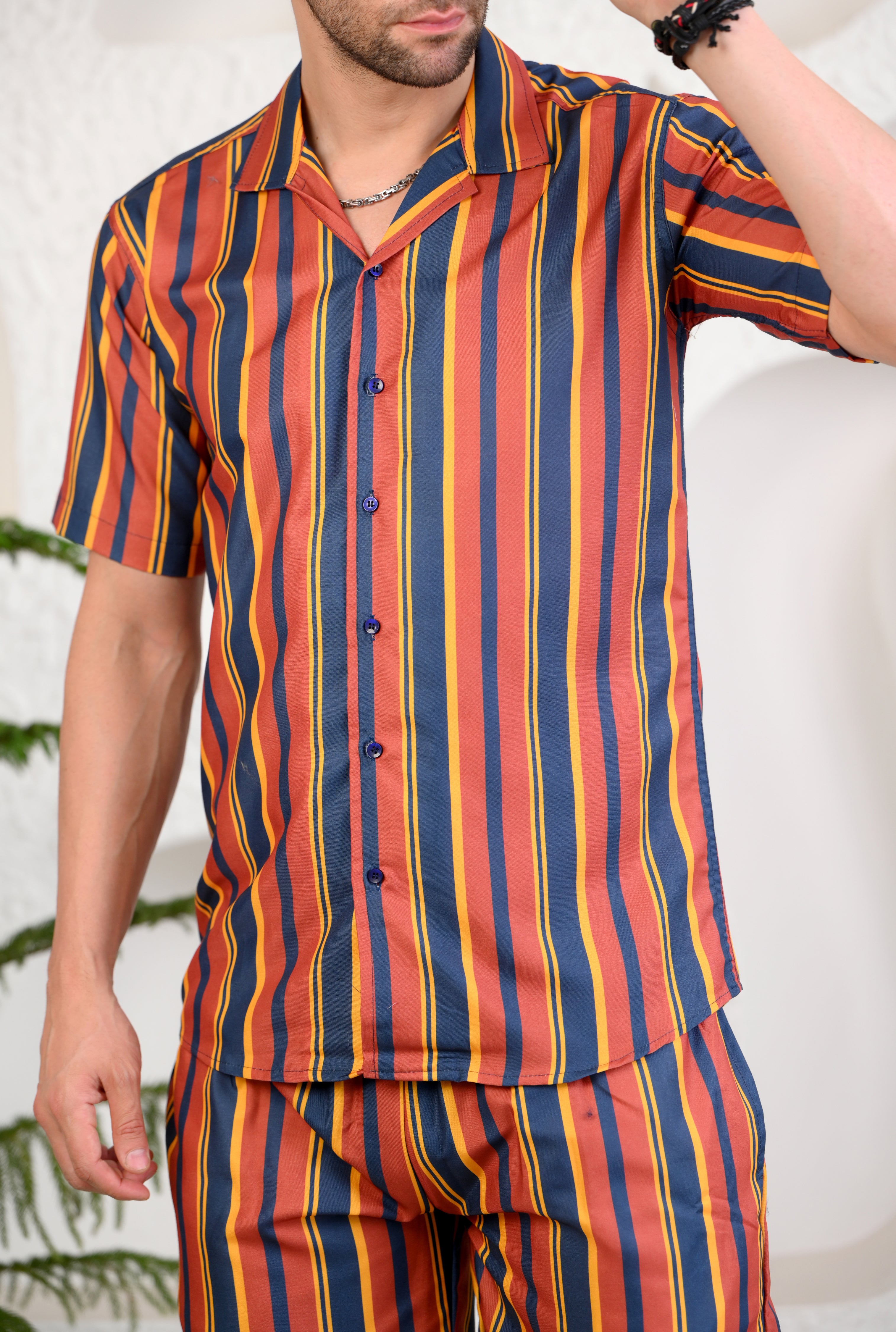 Turn heads with this vibrant multicolored striped co-ord set, designed for those who love a bold yet relaxed style. Featuring a Cuban collar short-sleeved shirt and matching shorts, this set combines classic charm with a modern, boxy fit. The breathable fabric ensures all-day comfort, while the striking stripe pattern adds a playful touch to your wardrobe. Perfect for casual outings, vacations, or weekend lounging, this set is your go-to for effortless style with a pop of color.