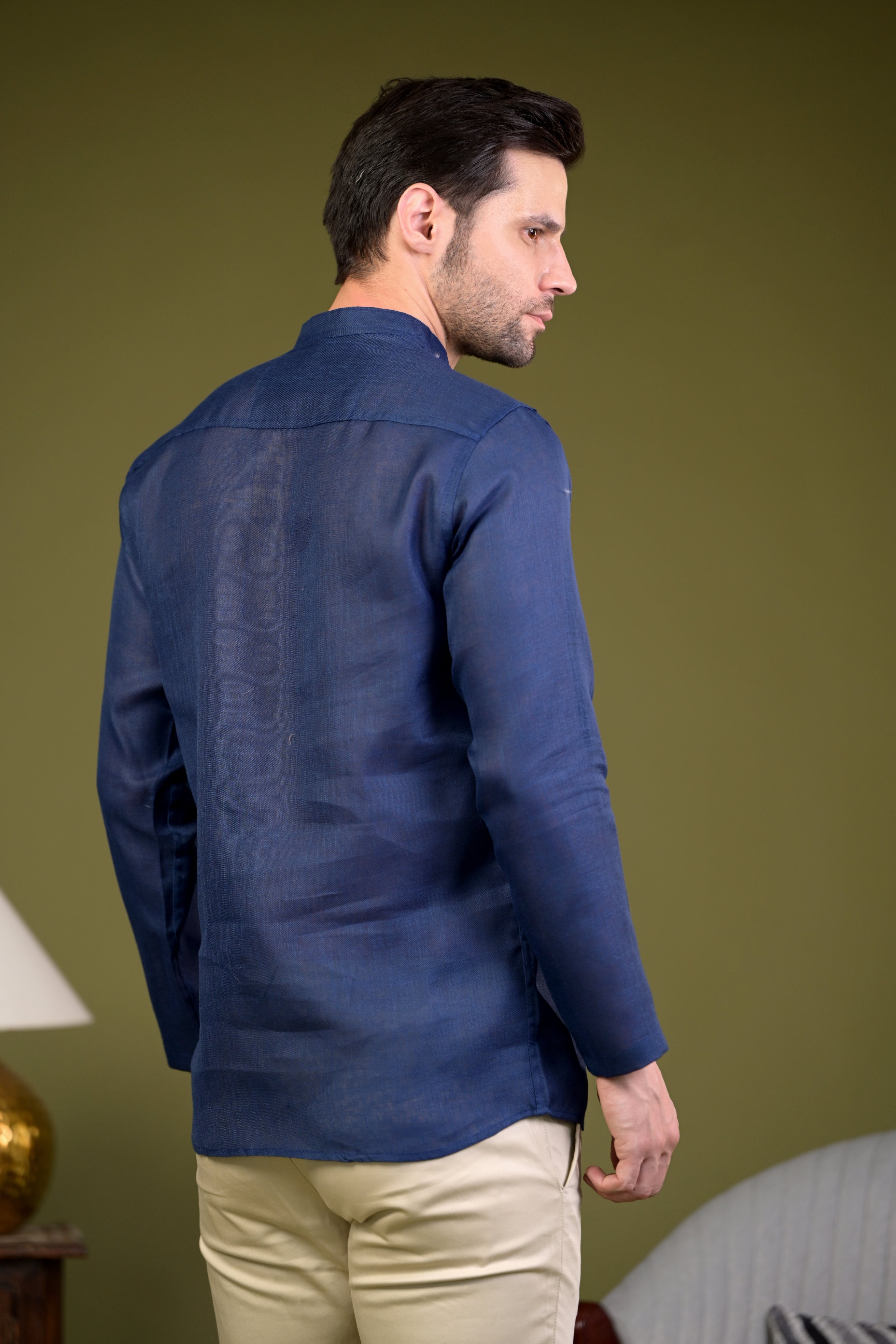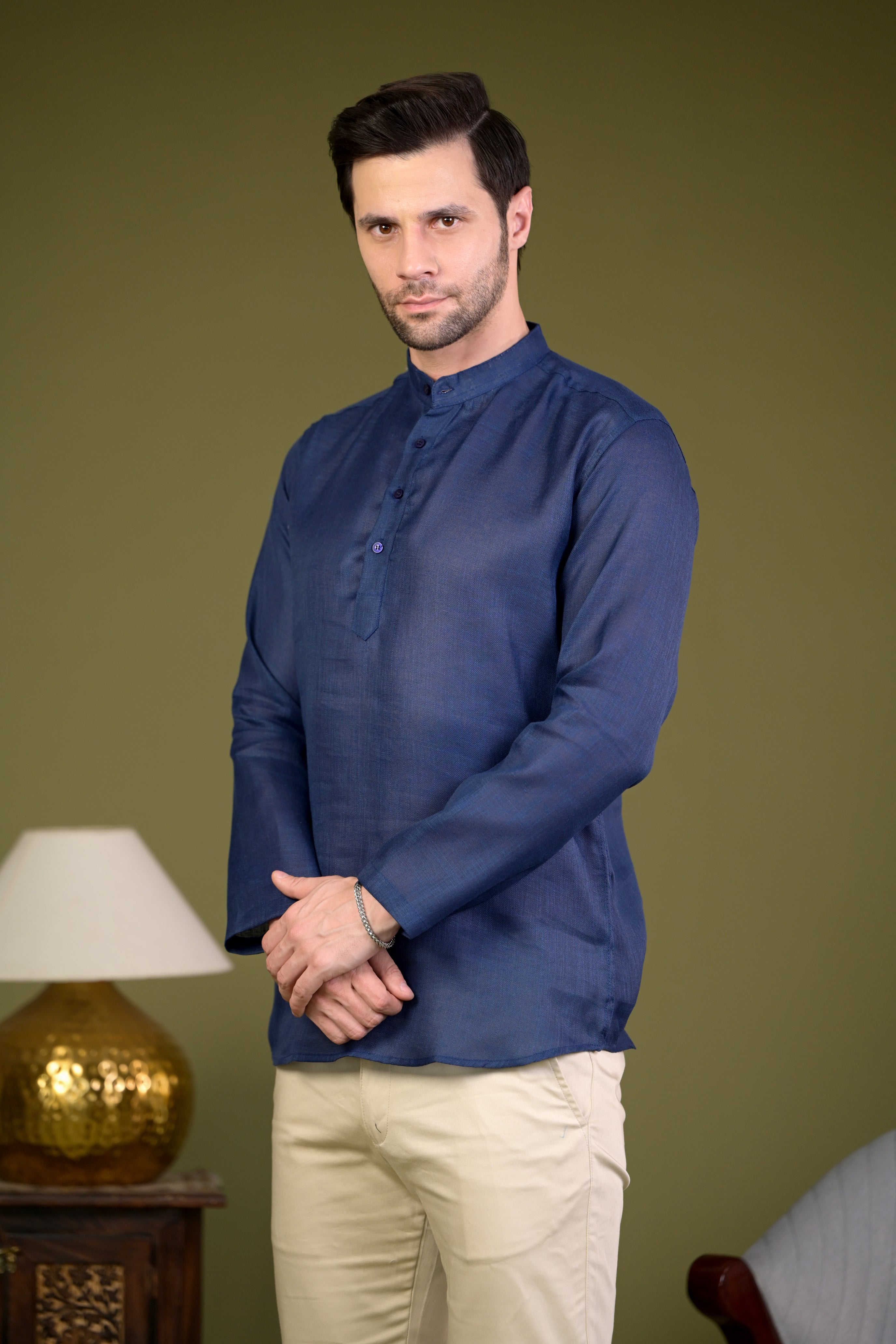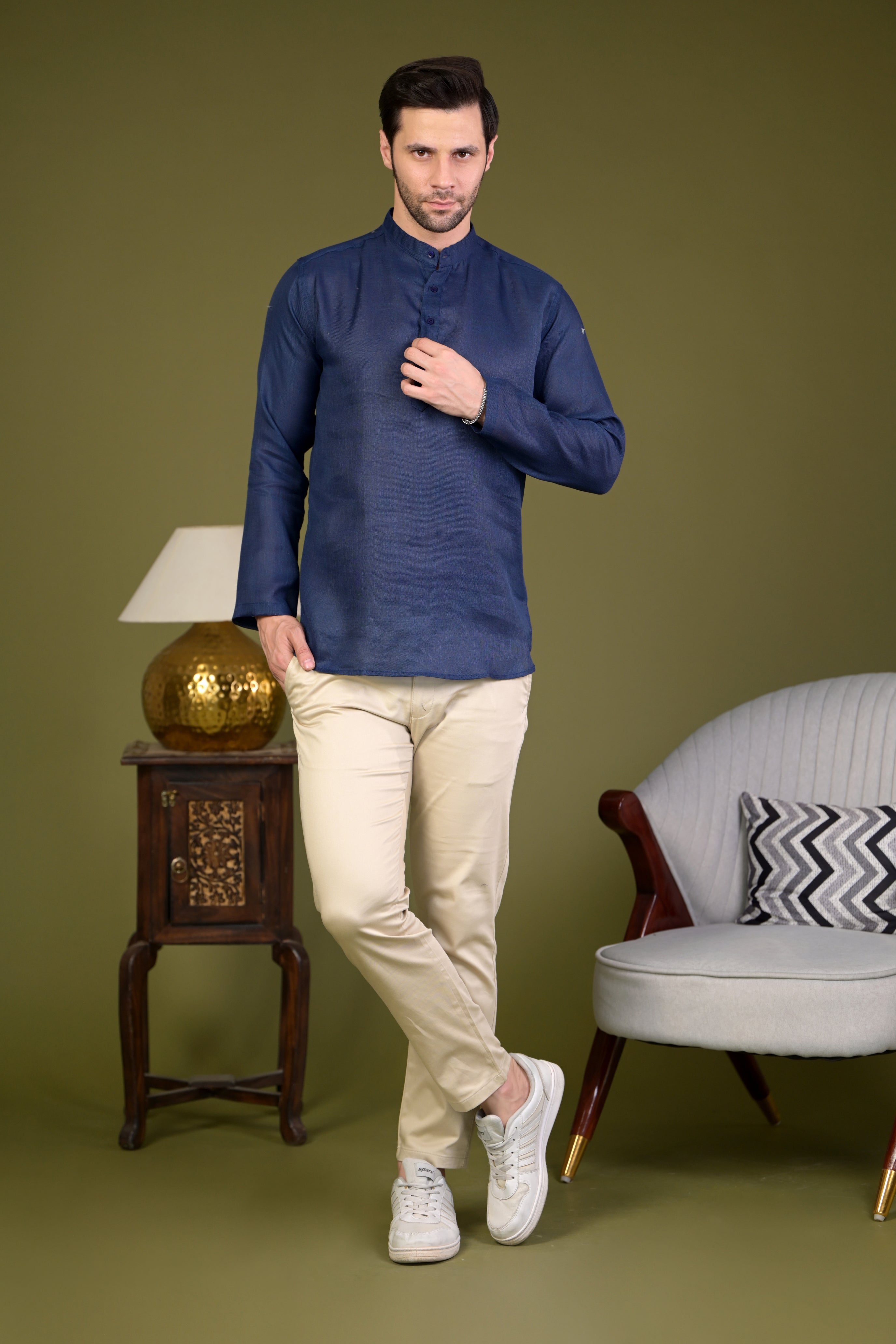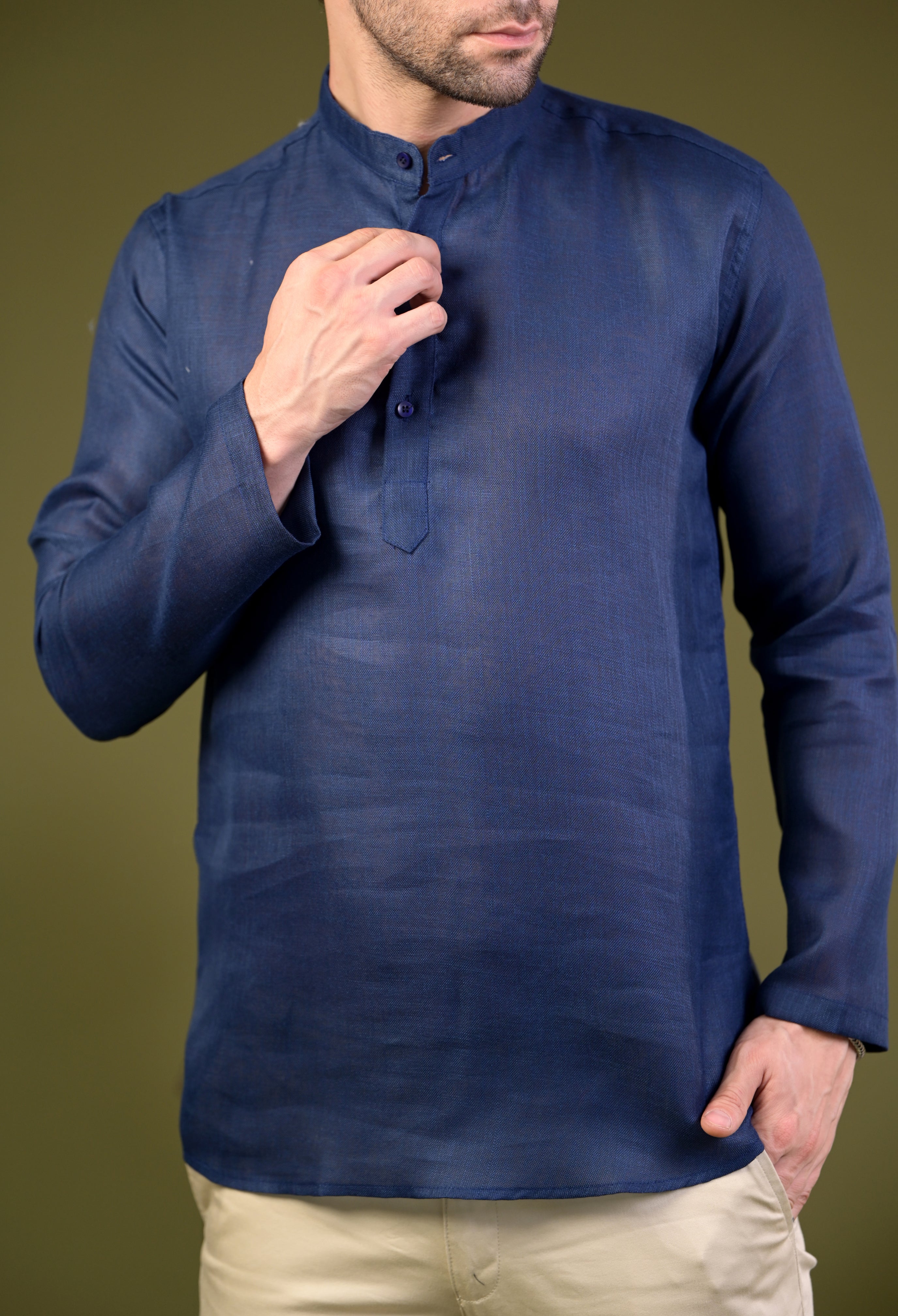 Crafted from a premium linen blend, this full-sleeved short kurta offers breathability, softness, and all-day comfort. The Mandarin collar adds a structured yet relaxed appeal, making it a versatile choice for casual gatherings, festive occasions, and semi-formal events. The rich navy blue color exudes elegance and pairs seamlessly with both traditional and contemporary outfits. Available in S, M, L, XL, XXL, this kurta ensures a perfect fit for every man.