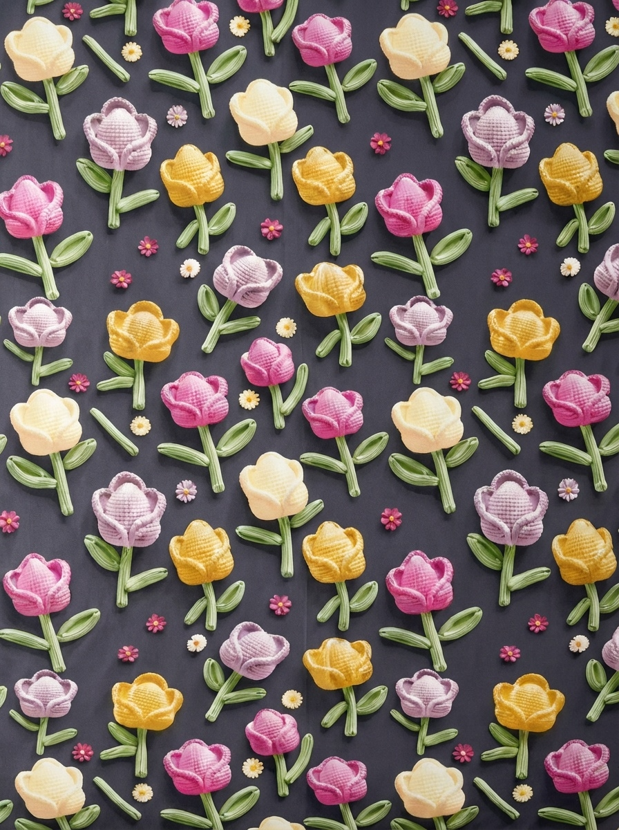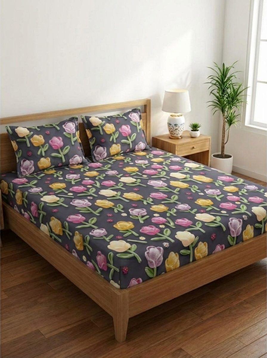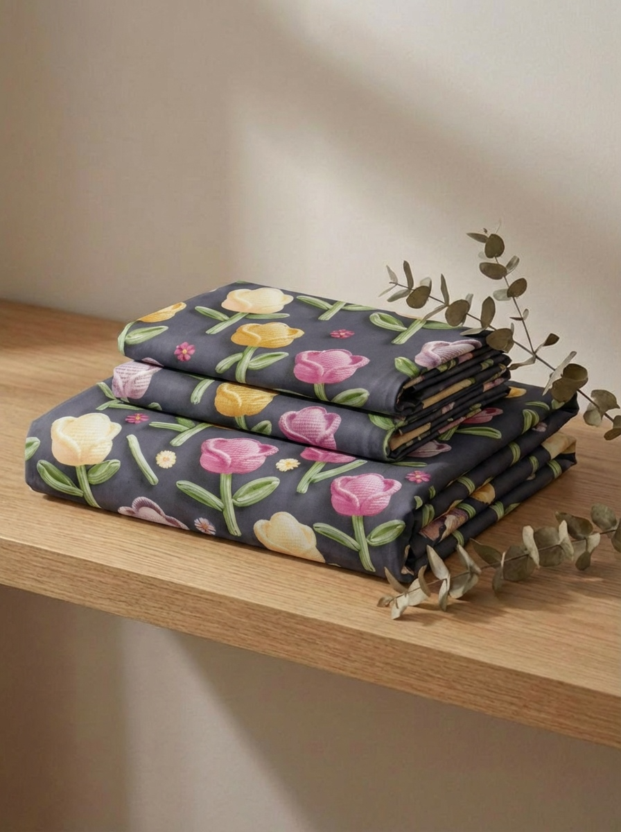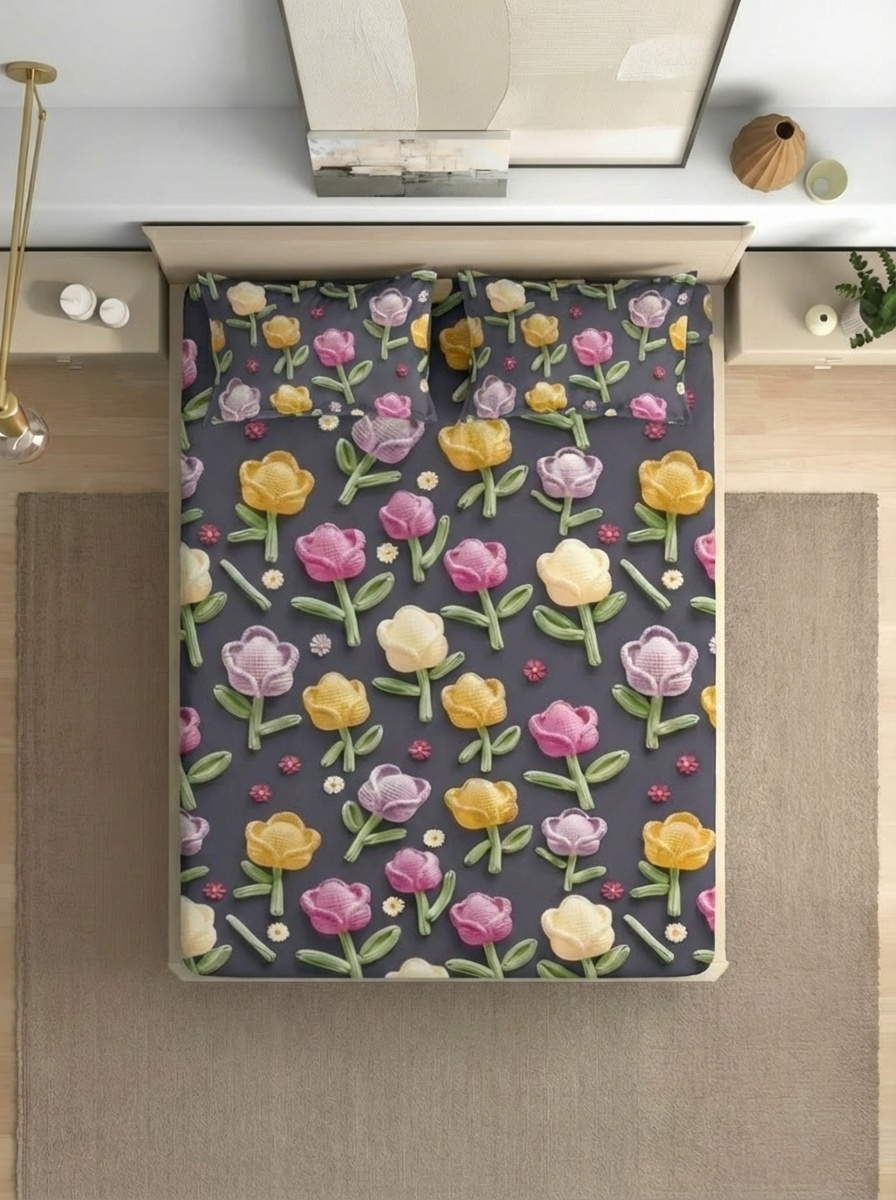Add a soft yet vibrant charm to your bedroom with the Pastel Petal Dreamscape โ 7D Floral Fitted Bedsheet. Featuring delicately crafted tulip-inspired florals in soothing pastel shades set against a rich dark base, this design creates a stunning visual contrast with a dimensional 7D effect ๐ธ