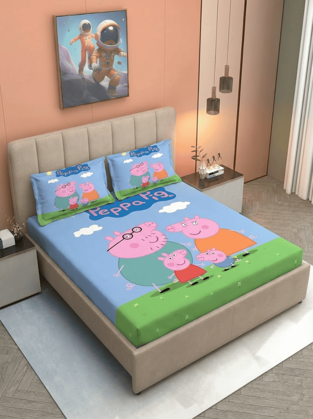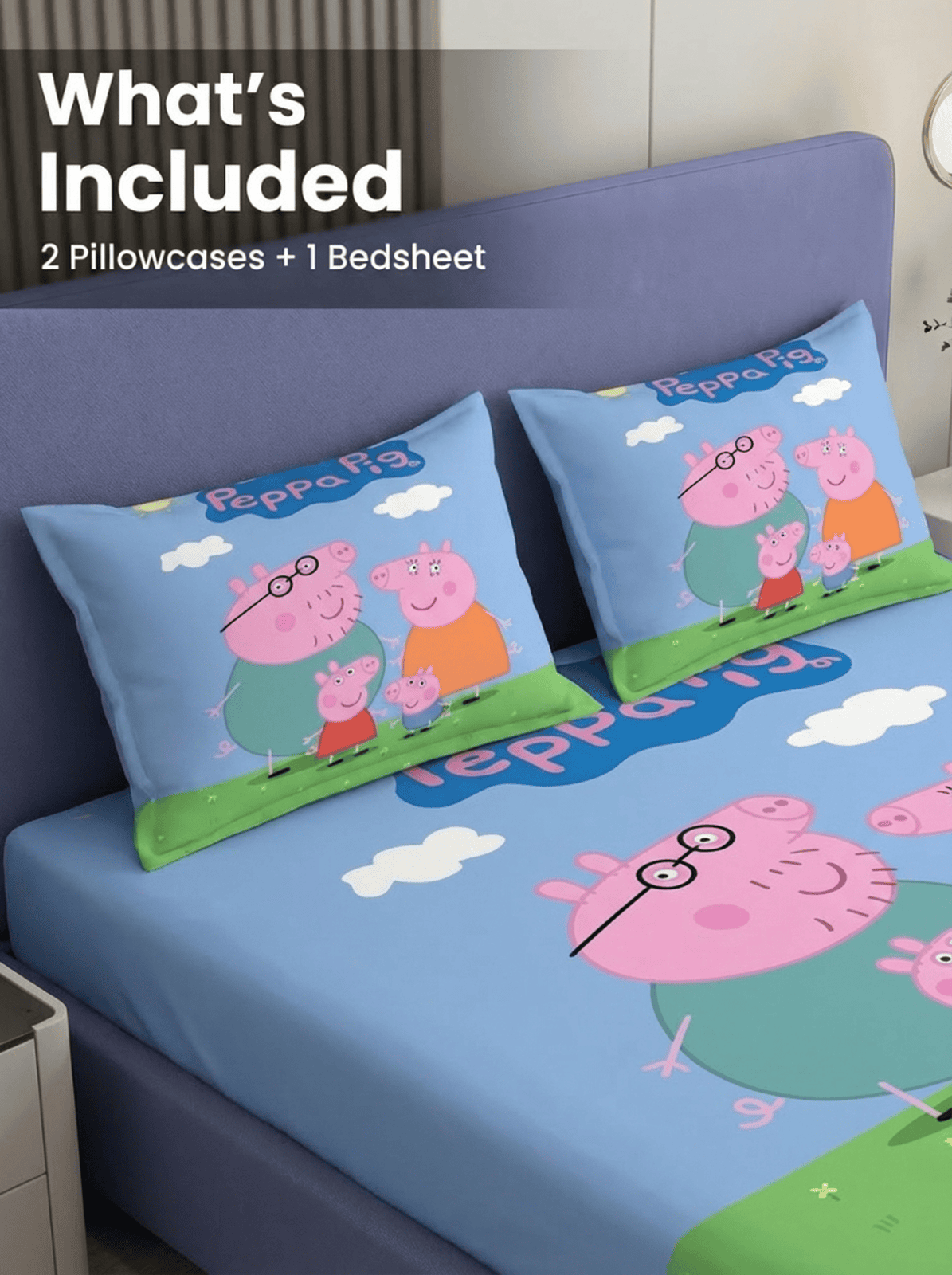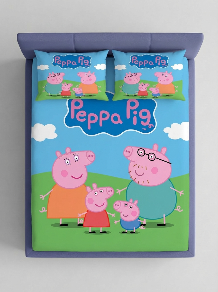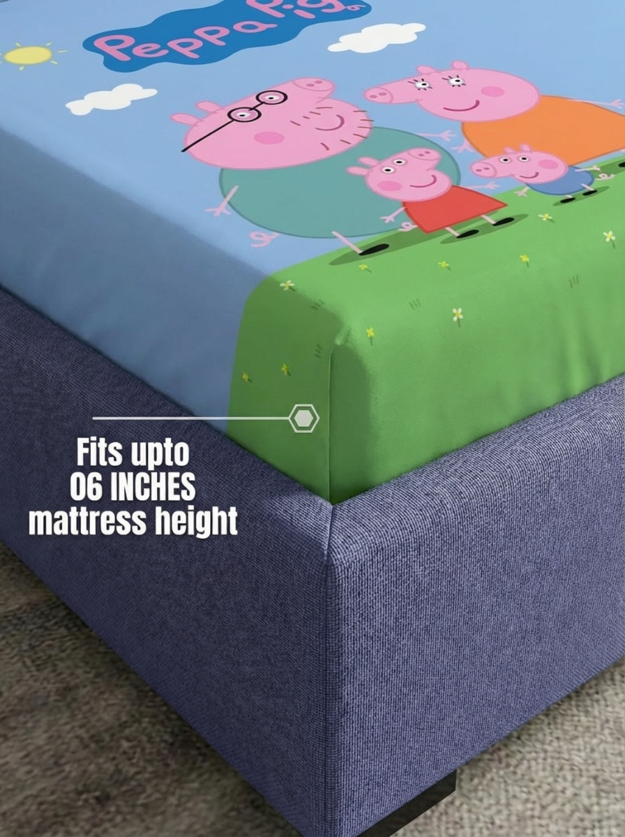 Make your childβs bedroom more fun and colorful with the Peppa World Kids fitted bedsheet. Featuring a cheerful cartoon family theme on a bright sky blue and green background, this bedsheet creates a playful and happy sleep environment.