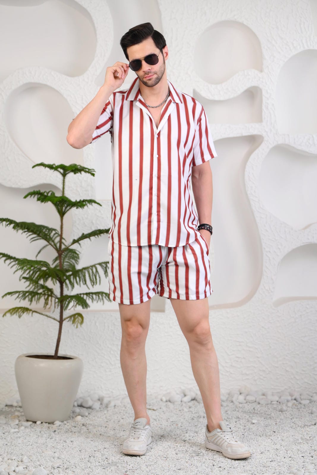 Upgrade your casual wardrobe with the Red & White Striped Co-ord Set, featuring a short-sleeved Cuban collar shirt and matching relaxed-fit shorts. The bold vertical stripes create a sharp, elongated look, making this set both stylish and flattering. Designed for comfort and breathability, the lightweight fabric ensures ease of movement, making it perfect for vacations, brunches, or casual outings. Whether you're looking for a standout streetwear look or an easy weekend outfit, this co-ord set delivers a timeless yet trendy appeal.
