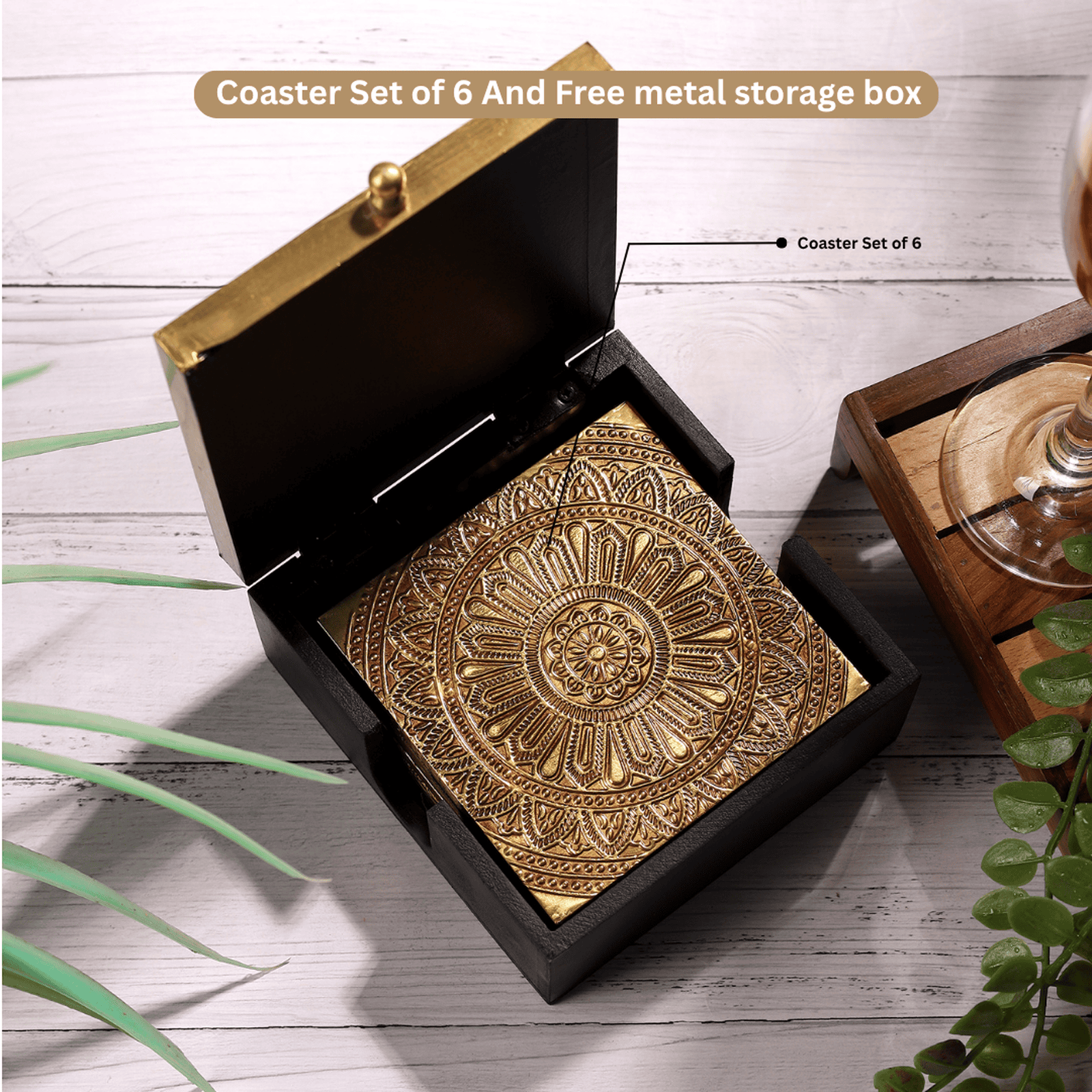 The coasters come neatly packed in a matching metal storage box, making them easy to store and perfect for gifting. A beautiful blend of tradition and utility, these coasters are designed to elevate your tea-time or cocktail hours with effortless grace.