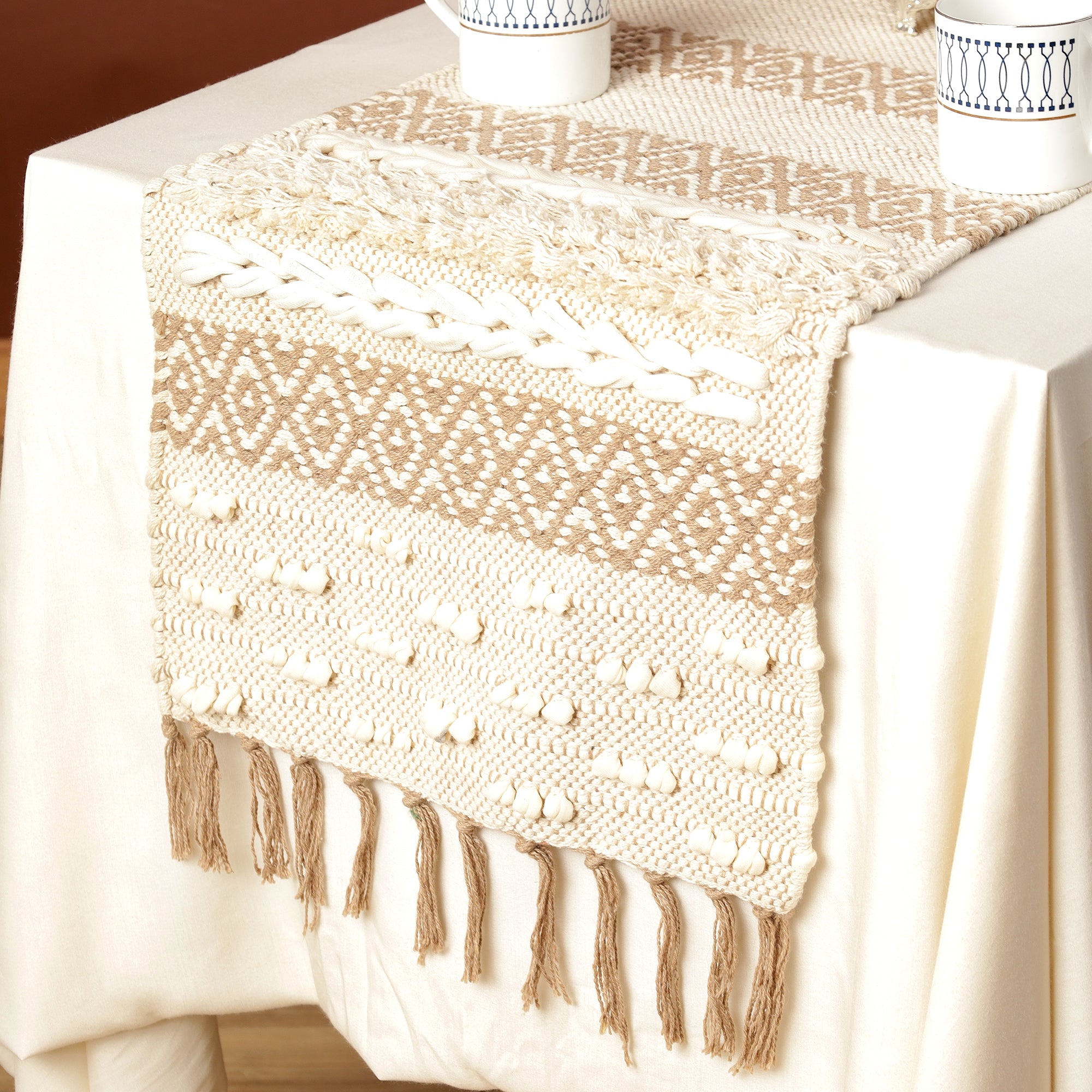 STYLISH DESIGN – Enhance your dining experience with this beautifully woven table runner featuring a sophisticated Soft knitted Beige Table Runner with tint of brown thread with intricate tassels.