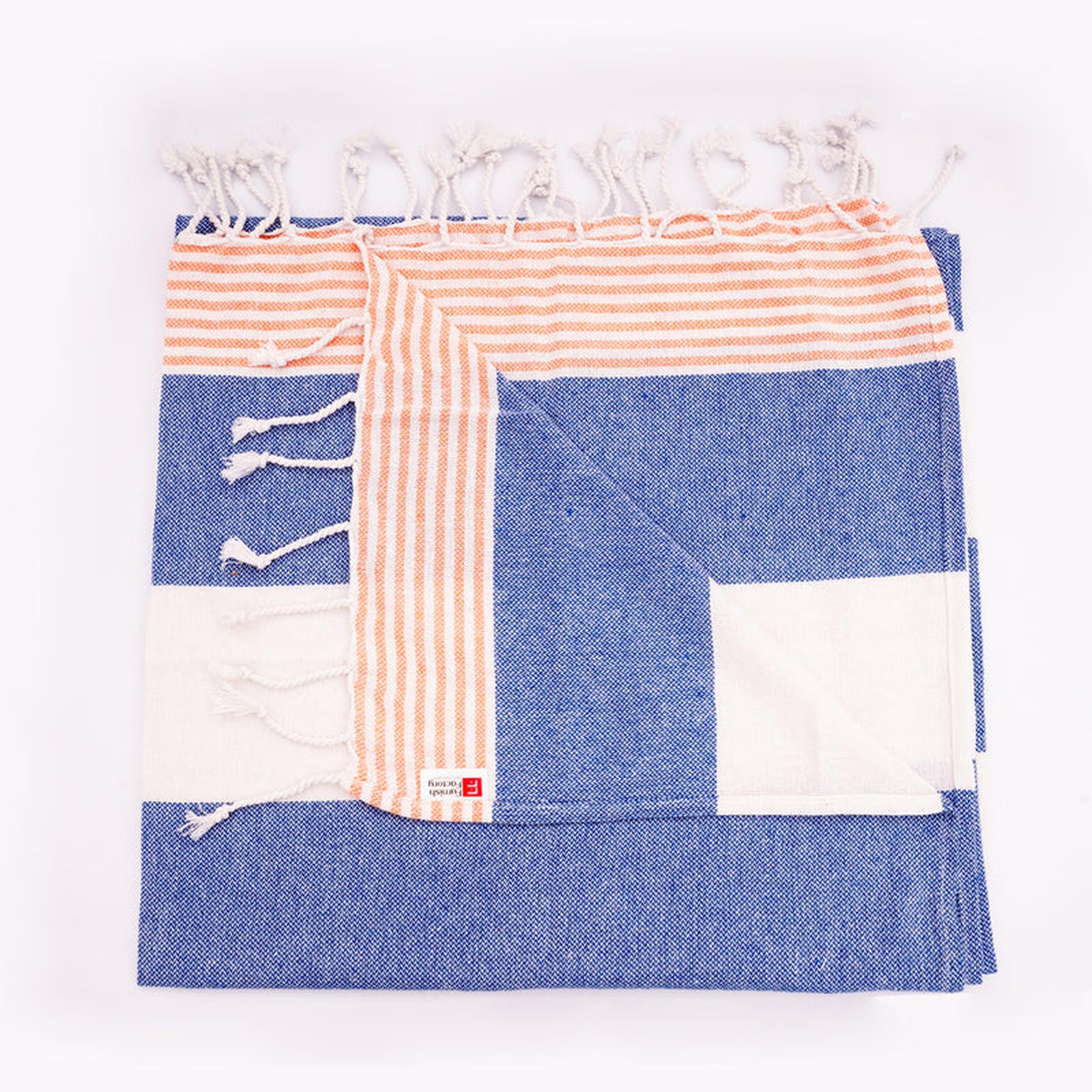 Elevate your everyday essentials with the Striped Turkish Towel, a perfect mix of style and functionality. Designed with a bold blue base, a crisp white stripe, and thin orange accents, this towel brings a modern yet timeless charm to your home. Crafted from 100% premium cotton, it offers exceptional softness, high absorbency, and quick-drying comfort.