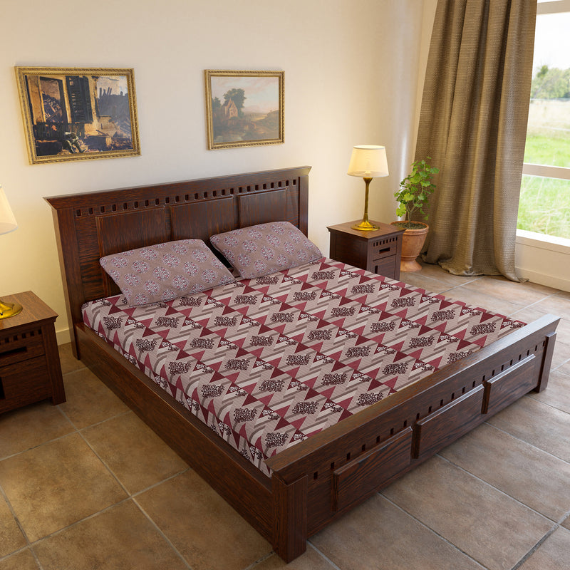 From our vibrant Rangrez Collection, the Heeraakriti Bedsheet beautifully blends tradition with modern artistry. The design features bold triangular patterns in rich maroon and beige shades, highlighted with delicate floral motifs that add elegance and depth. Paired with intricately patterned pillow covers, it creates a graceful and coordinated look for your bedroom.