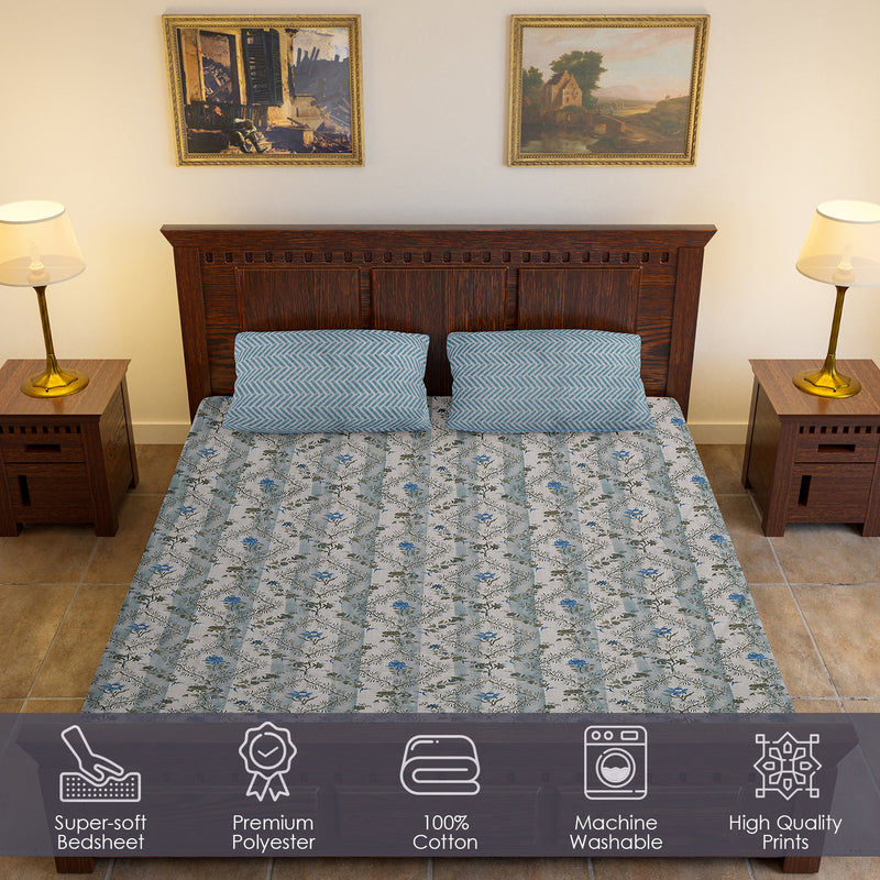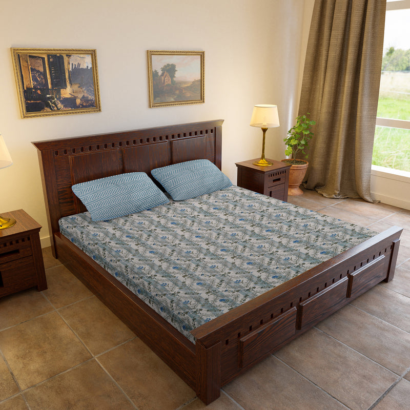 Bring home a touch of serenity with our Neel Pushp Bedsheet from the Gulmohar Dreams Collection. Designed with delicate blue floral vines set against a soothing base, this bedsheet adds an effortless charm and a refreshing vibe to your bedroom.