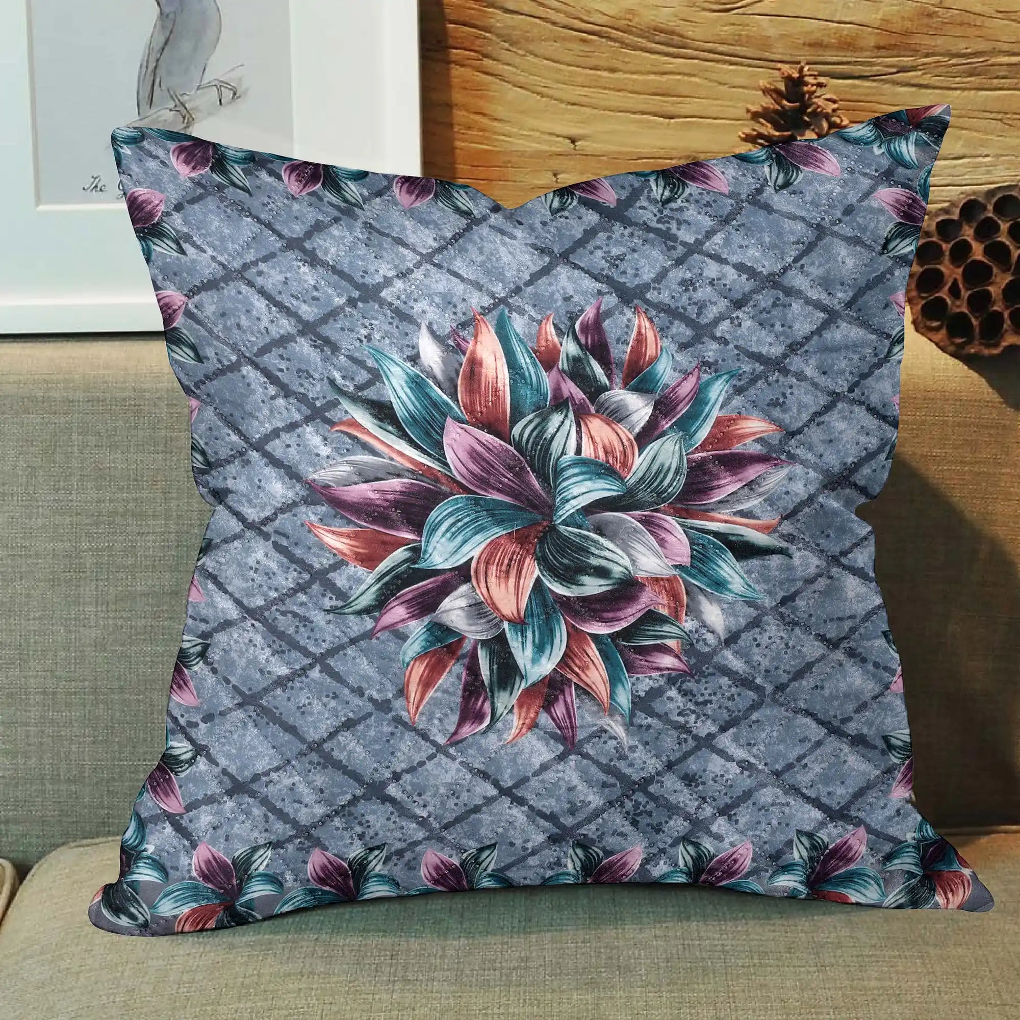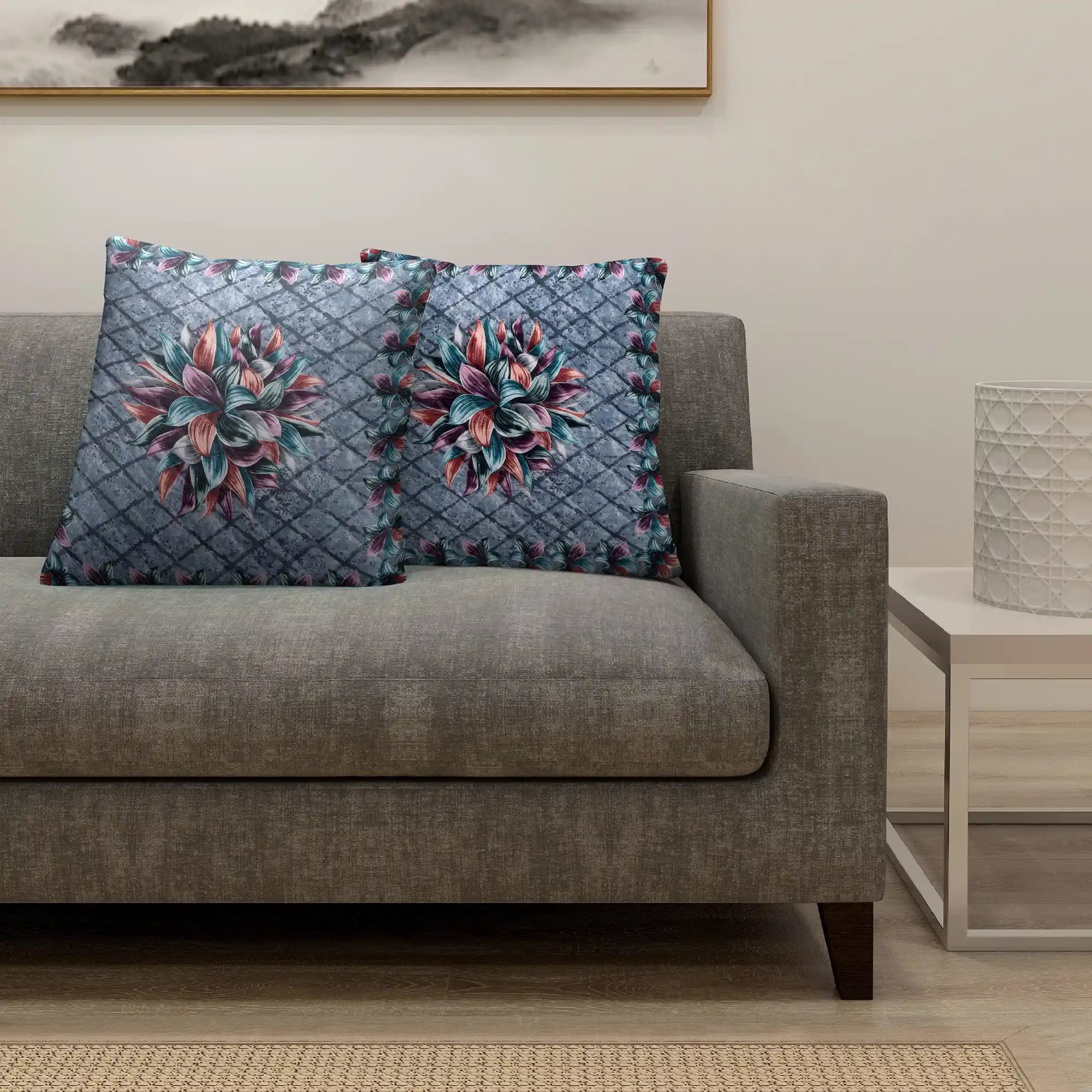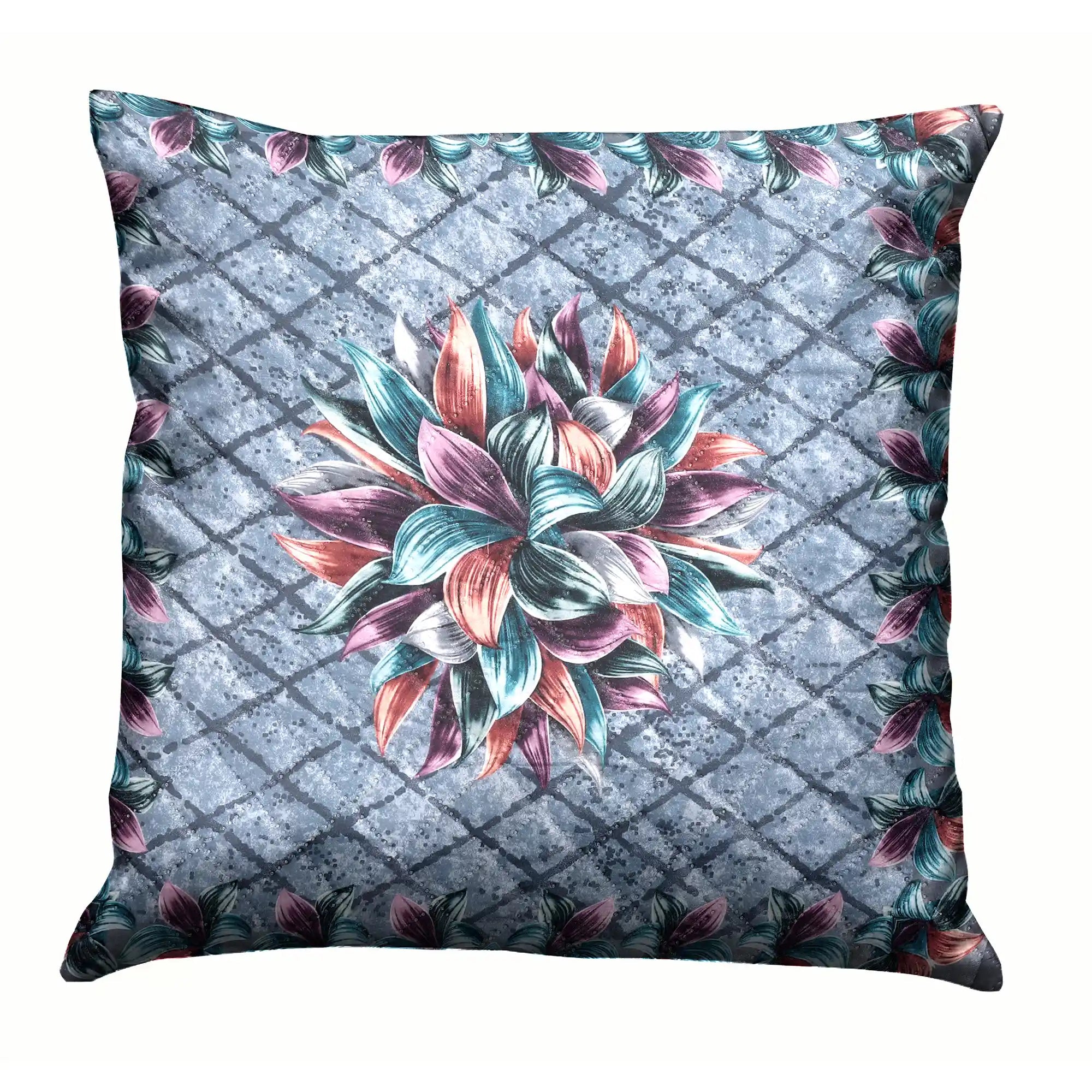 Add a touch of sophistication to your home décor with our Twilight Lily Cushion Cover. Featuring a stunning floral design inspired by twilight hues, this cushion cover combines deep shades of grey with beautifully blended tones of teal, mauve, and rust-orange. The intricate lily motif at the center is framed by a matching border, creating a perfect balance of modern elegance and timeless charm.