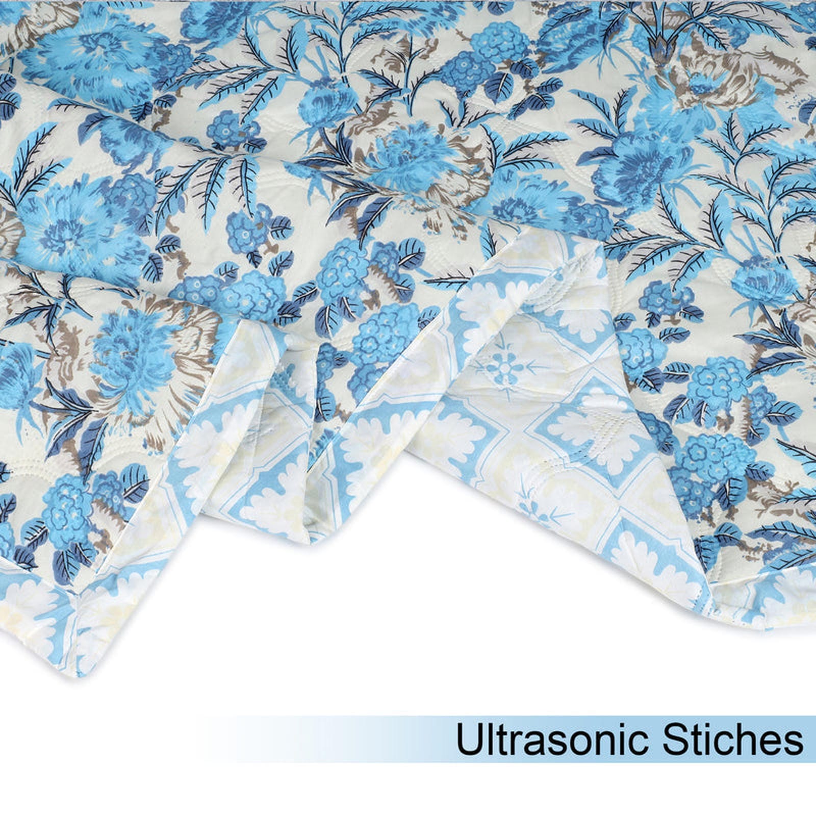 Transform your bedroom into a sanctuary of peace and style with our exquisite Ultrasonic Reversible Comforter, perfectly sized for Queen beds at 90x90 inches. This comforter is a masterpiece of dual design, offering two distinct aesthetics to suit your mood or decor. One side showcases an enchanting display of classic blue floral motifs gracefully detailed with subtle bronze-gold accents against a soft, creamy background. Flip it over to reveal a captivating pattern of linked blue geometric shapes, each centered with a delicate star-like element on the same serene cream base, adding a touch of contemporary elegance.