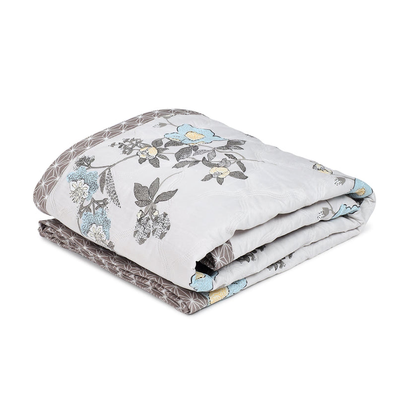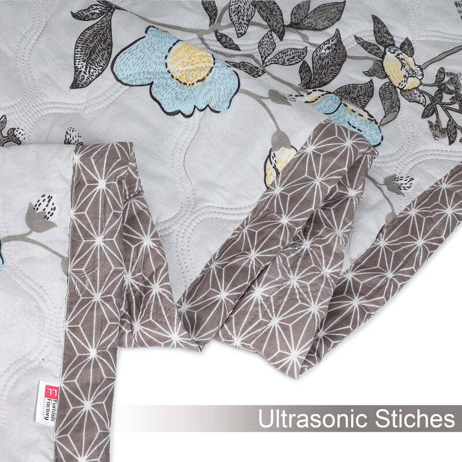 Elevate your sleep space with our Ultrasonic Reversible Comforter, perfectly sized at 90x90 inches for Queen beds. Immerse yourself in the tranquil beauty of its dual design: one side showcases a calming cream backdrop adorned with gracefully scattered blue and yellow floral sprigs and leaves, evoking a sense of peaceful serenity. Flip it over to reveal a modern grey geometric lattice pattern, offering a touch of contemporary sophistication. This reversible design allows you to effortlessly refresh your bedroom's aesthetic whenever inspiration strikes.