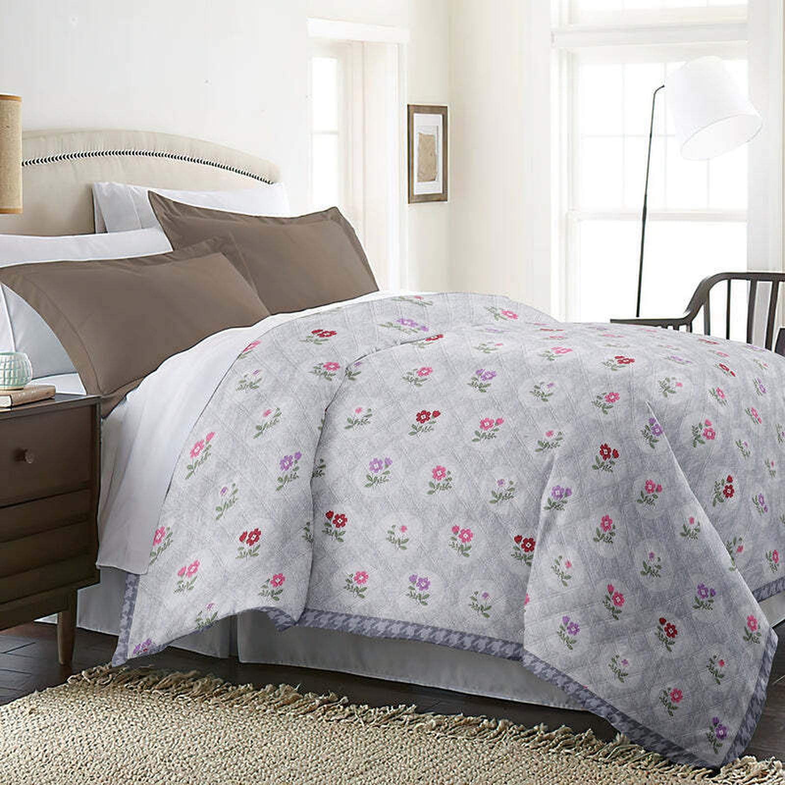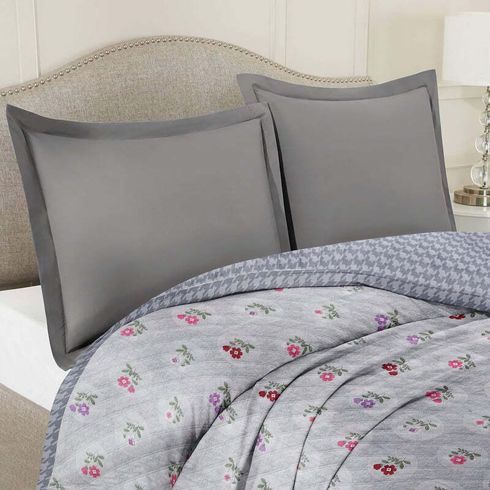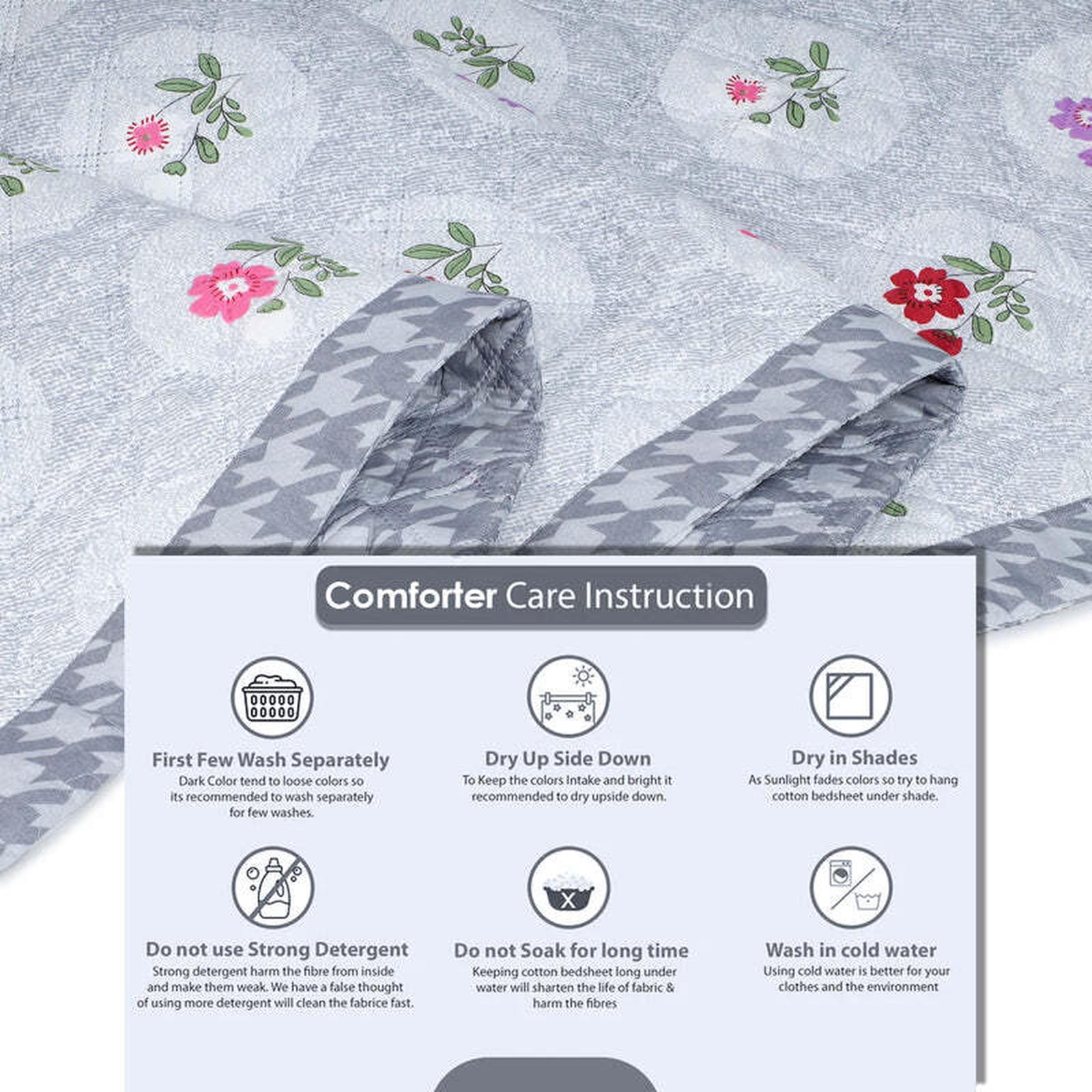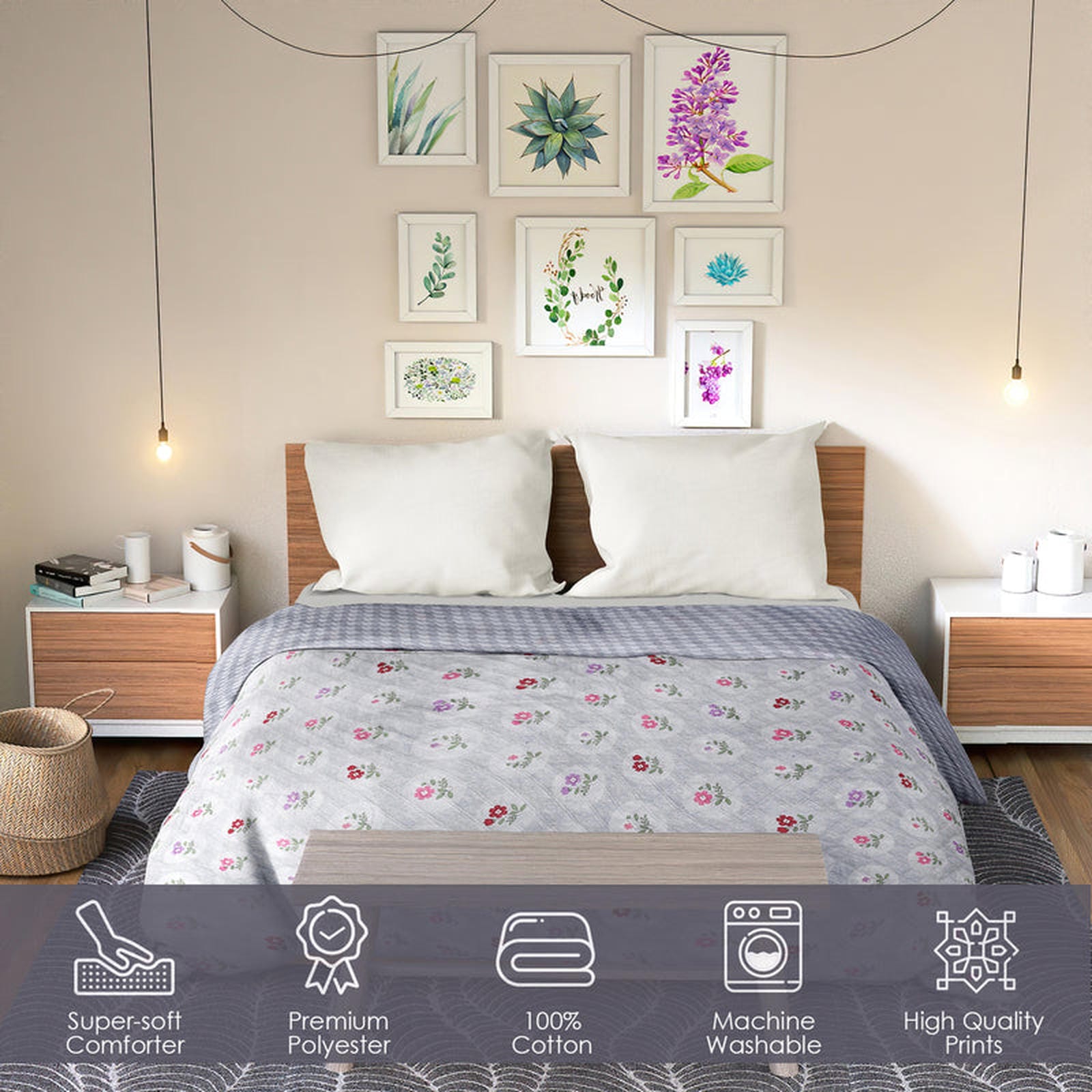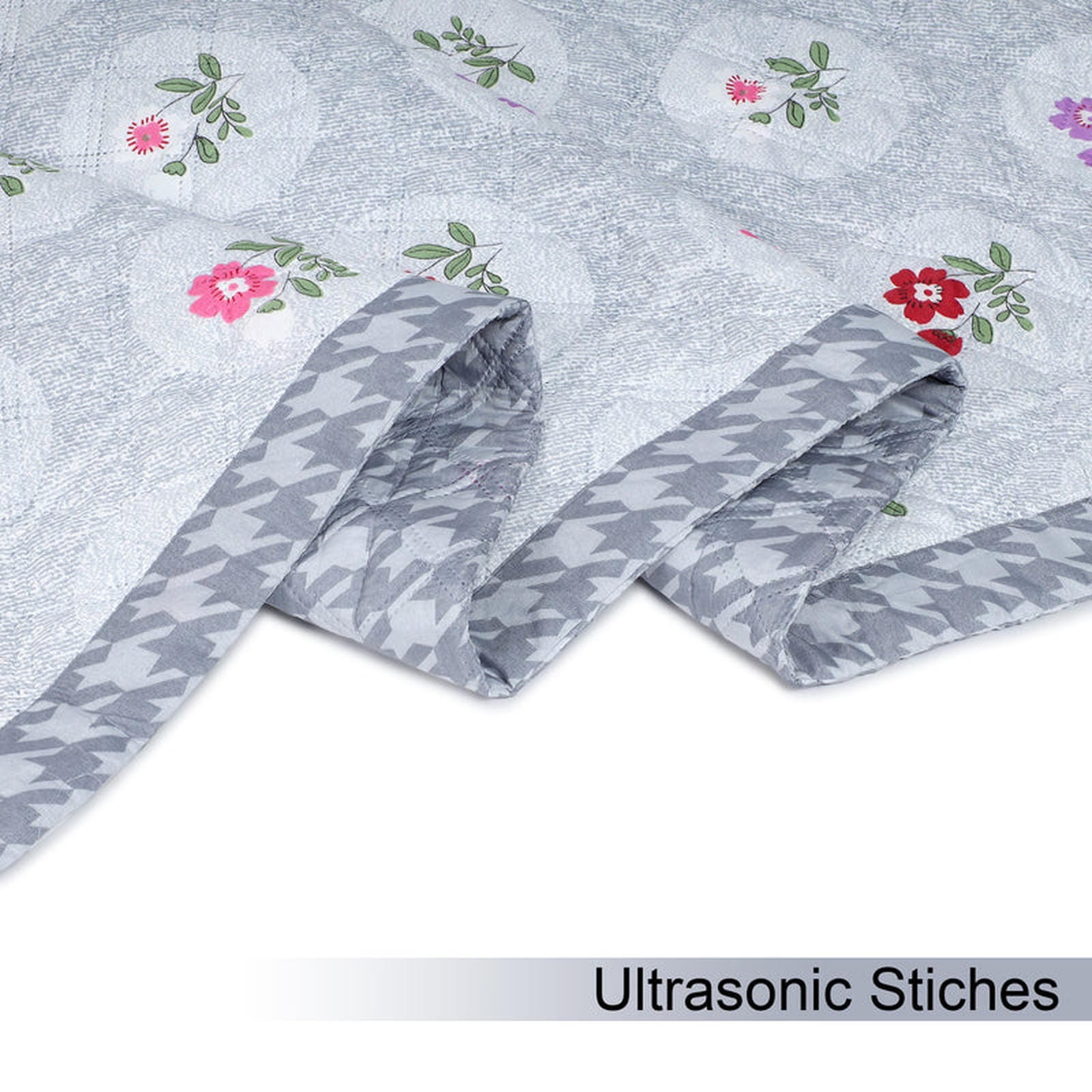 Transform your sleep sanctuary into a haven of comfort and style with our Ultrasonic Reversible Comforter, generously sized for Queen beds (90x90 inches). This elegant comforter offers two distinct looks: one side boasts a charming grey and white floral and circular pattern, while the other features a timeless grey and white houndstooth design. This versatility allows you to effortlessly refresh your decor to match your mood or the season.