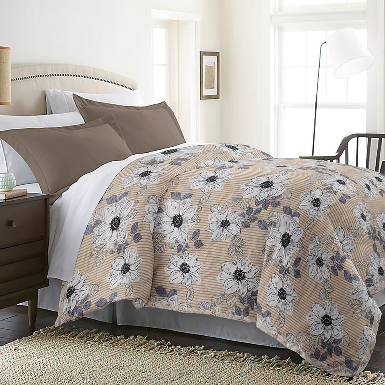 π Soft, Stylish & Versatile! Enhance your bedroom with our elegant tan and white reversible comforter, featuring a sophisticated floral and striped pattern on one side and a chic geometric design on the reverse for a refined and cozy upgrade.
