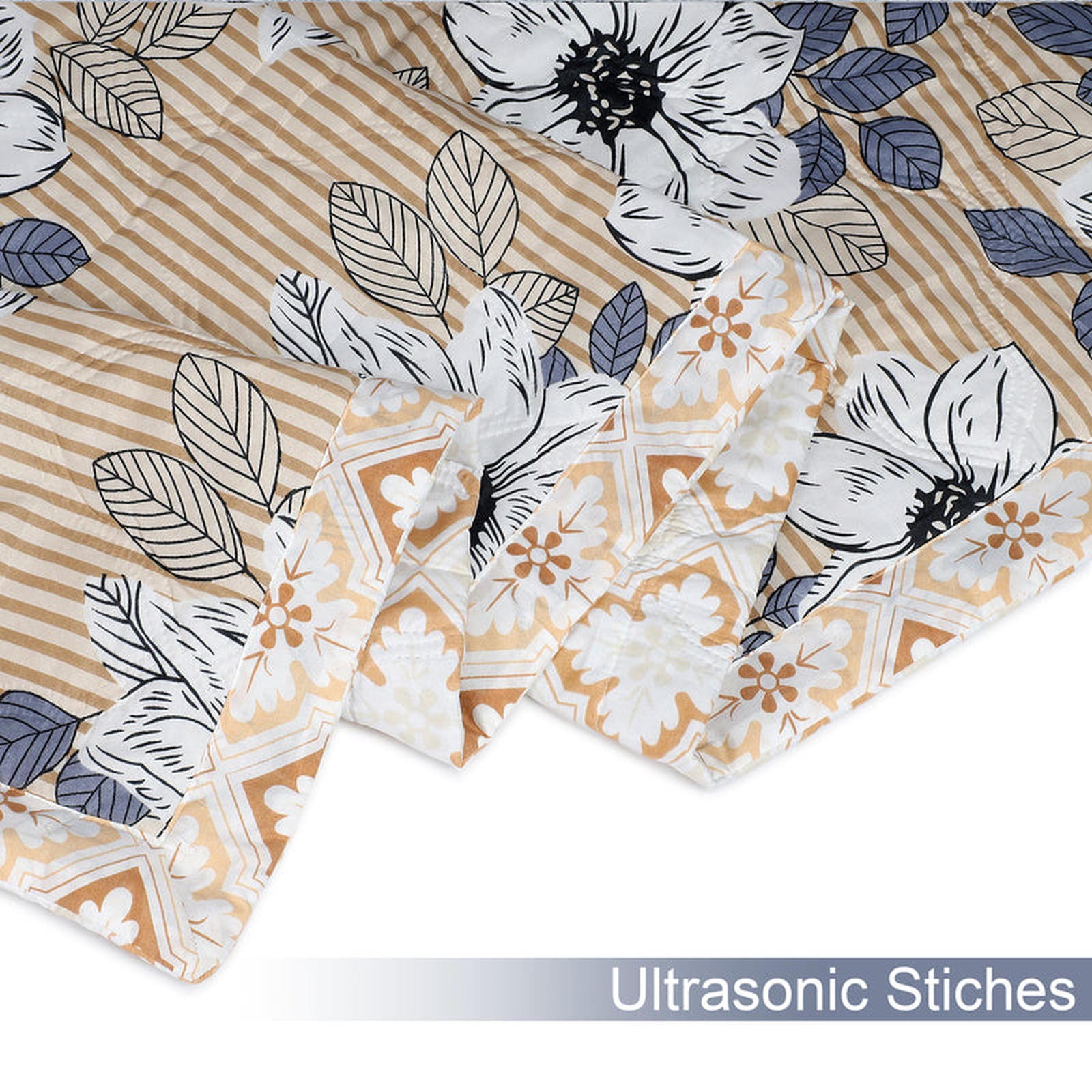 Discover the perfect blend of comfort and versatility with our Ultrasonic Reversible Comforter, designed to fit Queen beds at a generous 90x90 inches. This exquisite comforter is a true two-in-one marvel, allowing you to easily switch between a serene floral and subtle striped motif on one side and a contemporary geometric pattern on the reverse. Both designs feature soothing tan and white tones, creating an inviting and stylish atmosphere in your personal retreat.