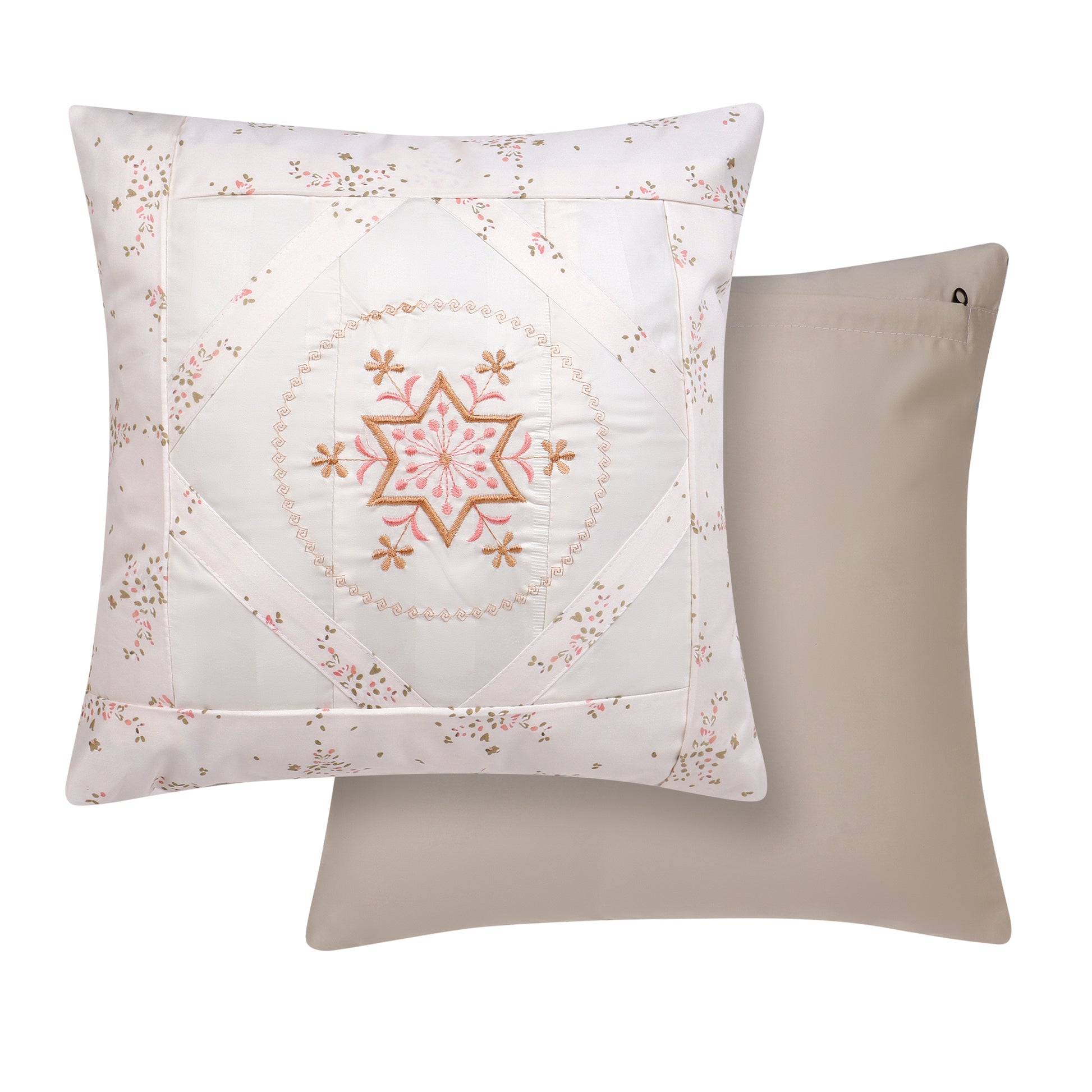 Elevate your home décor with timeless charm using our 14x14 handcrafted embroidered cushion cover. This piece showcases a beautifully detailed central medallion in soft peach and warm beige tones, surrounded by delicate floral embroidery that adds a vintage, heirloom touch to your space.